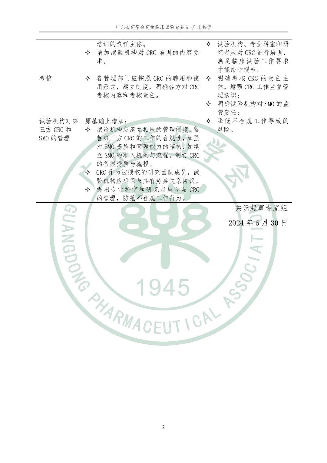 附件: 1、《药物临床试验CRC管理–广东共识(2024年版)》起草专家组 2、《药物临床试验CRC管理–广东共识(2024年版)》(请在本会网站“下载专区”下载) 广东省药学会 2024年7月30日 附件2 |