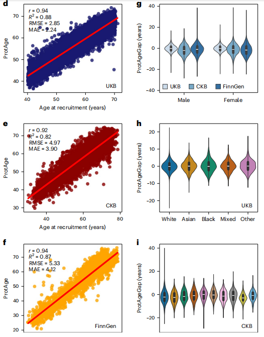 作者还计算了所有三个队列中参与者的ProtAgeGap,作为ProtAge和实足年龄之间的差异。在英国,ProtAgeGap前5%和后5%人群的平均ProtAgeGap年限分别为6.3年和- 6年,导至他们之间的生物衰老平均相差约12.3年。ProtAgeGap在不同性别、不同种族和不同地理区域中均显示出相似的分布(图g-i)。