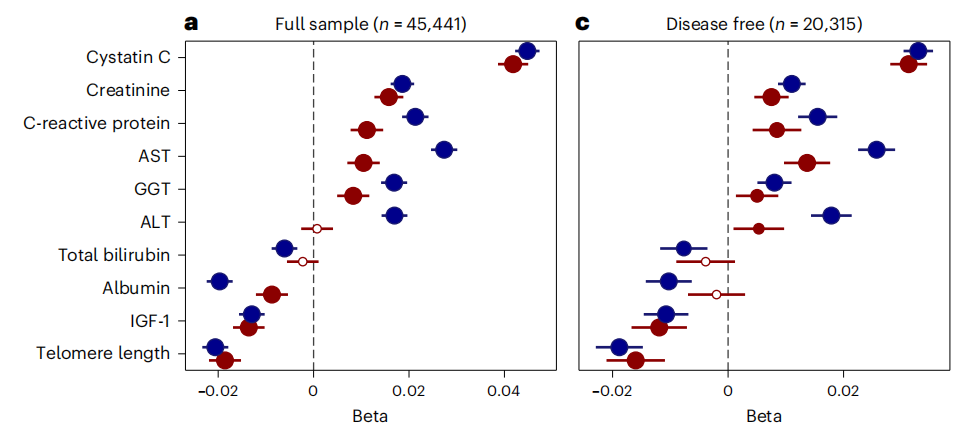 为了了解蛋白质组衰老如何影响与衰老相关的生理和认知功能,作者研究了ProtAgeGap与数十项与年龄相关的生物衰老、身体和认知功能的关联。结果发现,ProtAgeGap与除两项肝脏生物标志物(丙氨酸转氨酶(ALT)和总胆红素)外的所有调查指标均显著相关(图a)。在生物衰老机制中(图a), ProtAgeGap的增加与两种肾功能生物标志物(Cystatin C和肌酐)、两种肝酶(AST、GGT)和C反应蛋白水平的升高有关;并与白蛋白、IGF-1水平和端粒长度下降有关。在身体测量中, ProtAgeGap的增加与自评健康状况差、步行速度慢、自评面部年龄大于平均水平、每天睡眠≥10小时、每天感到疲倦和频繁失眠有关。ProtAgeGap的增加还与虚弱指数、收缩压和舒张压、反应时间、动脉硬度和体重指数(BMI)升高有关;骨密度、流体智力、肺功能和握力的降低有关。