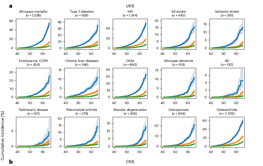 UKB队列中,ProtAgeGap的最高、中位数和最低十分位数在全因死亡率和14种常见非癌症疾病发病率上存在差异(图a)。ProtAgeGap最高十分位数的累积发病率最高的是骨关节炎(59.4%)、全因死亡率(55.2%)、IHD(50.6%)、2型糖尿病(35.3%)和慢性肾病(33.6%)。在UKB队列中,所有模型均显示ProtAgeGap与死亡率和除帕金森病以外的所有非癌症事件疾病结局的显著关联。