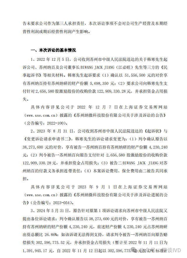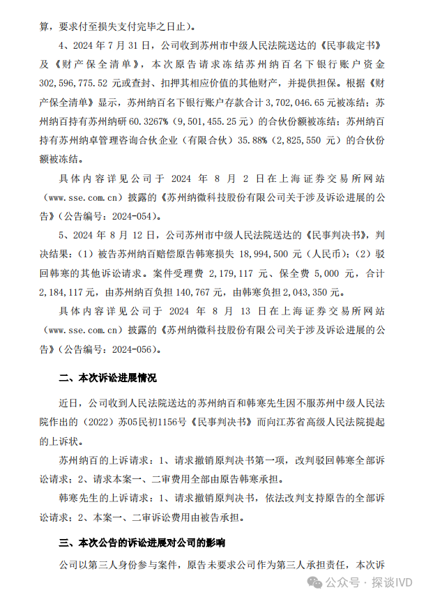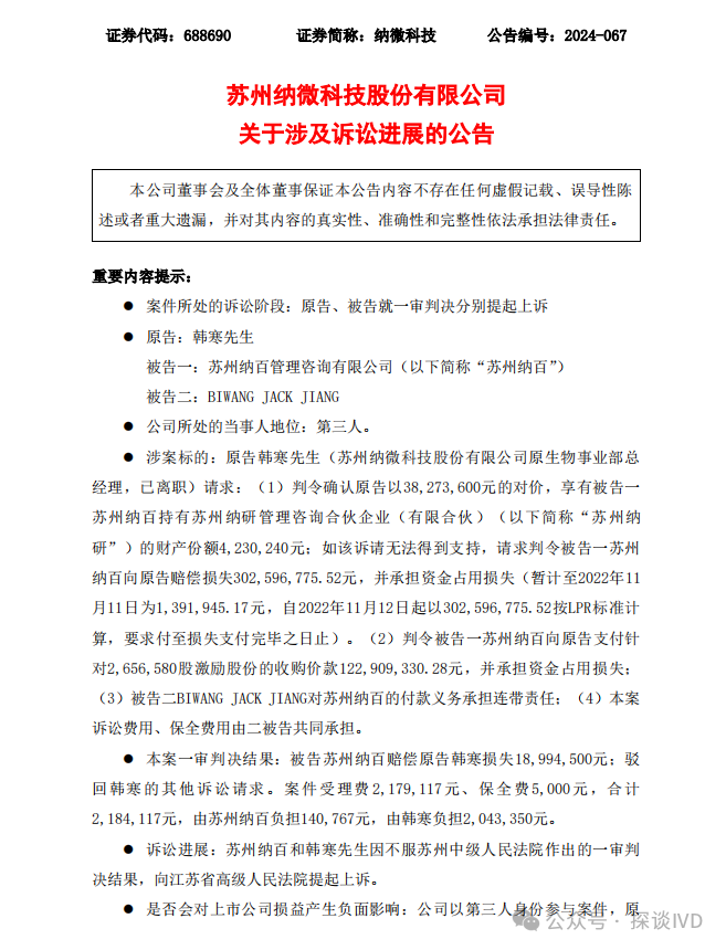 公司所处的当事人地位:第三人。 原告韩寒先生(苏州纳微科技股份有限公司原生物事业部总经理,已离职)请求: 1.判令确认原告以38,273,600元的对价,享有被告一苏州纳百持有苏州纳研的财产份额4,230,240元;如该诉请无法得到支持,请求判令被告一苏州纳百向原告赔偿损失302,596,775.52元,并承担资金占用损失(暂计至2022年11月11日为1,391,945.17元,自2022年11月12日起以302,596,775.52按LPR标准计算,要求付至损失支付完毕之日止)。 2.令被告一苏州纳百向原告支付针对2,656,580股激励股份的收购价款122,909,330.28元,并承担资金占用损失; 3.被告二BIWANG JACK JIANG对苏州纳百的付款义务承担连带责任; 本案一审判决结果: 1.被告苏州纳百赔偿原告韩寒损失18,994,500元;驳回韩寒的其他诉讼请求。 2.案件受理费2,179,117元、保全费5,000元,合计2,184,117元,由苏州纳百负担140,767元,由韩寒负担2,043,350元。 苏州纳百的上诉请求: 1、请求撤销原判决书第一项,改判驳回韩寒全部诉讼请求; 韩寒先生的上诉请求: 1、请求撤销原判决书,依法改判支持原告的全部诉讼请求; |