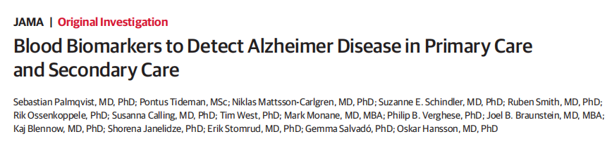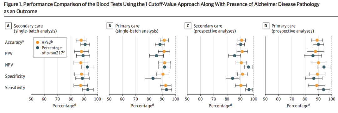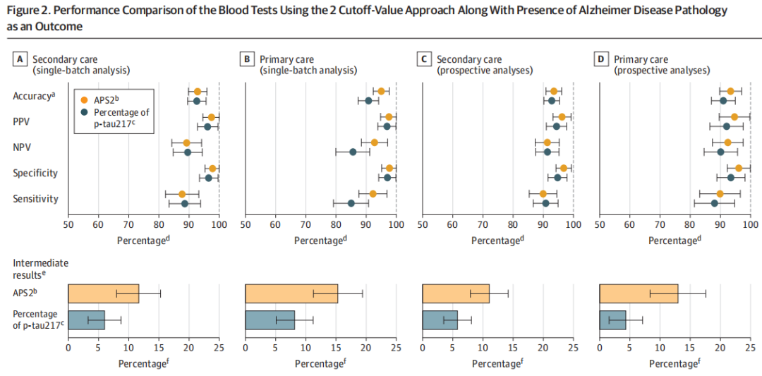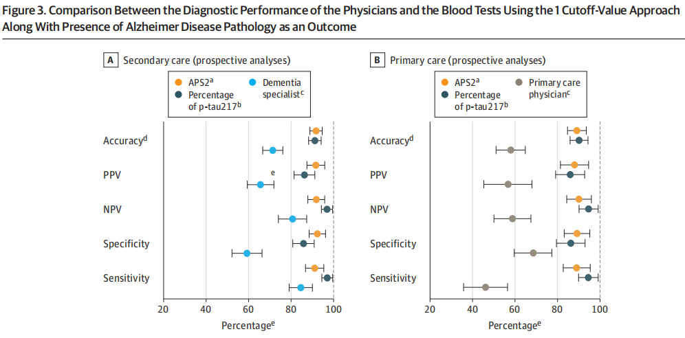 在初级和二级保健诊所中,阿尔茨海默病血液生物标志物最有希望的是血浆p-tau217,和p-tau217的百分比,Aβ42:Aβ40血浆比值。p-tau217与Aβ42:Aβ40血浆比值联用时,可提高诊断准确性。这些生物标志物必须在初级保健中进行验证,并在诊断准确性方面与标准的临床评估进行比较。 近日,医学期刊JAMA(IF 63)上发表了一篇题为“Blood Biomarkers to Detect Alzheimer Disease in Primary Care and Secondary Care”的文章。研究团队利用预先定义的生物标志物cutoff值,对初级保健和二级保健中临床可用的阿尔茨海默病血液检测方法,p-tau217的百分比,以及APS2(Aβ42:Aβ40血浆比值)进行前瞻性评价。结果发现使用APS2和p-tau217百分比对识别有认知症状的个体具有明显更高的诊断准确性。未来的研究应该评估这些生物标志物的血液检测如何影响临床护理。 图片来源:JAMA 主要内容 参与者和生物标志物特征 有1213名有认知症状患者(515名来自初级保健,698名来自二级保健)参与了该研究。平均年龄为74.2岁,48%为女性。初级保健和二级保健队列AD病理患病率没有差异(初级为49.9%,二级保健队列中为49.7%)。 二级保健队列中 单独APS2 vs P-Tau217的诊断性能 当预定义的单一截止值应用于二级保健队列,APS2的诊断准确率为88%,而p-tau217的诊断准确率为91%。当使用APS2时,阳性预测值为88%,阴性预测值为87%,AUC为0.96。当单独使用p-tau217的百分比时,阳性预测值为89%,阴性预测值为92%,AUC为0.97(图1A)。 采用双截止值法,使用APS2的诊断准确率为93%,阳性预测值为97%,阴性预测值为89%;12%的结果位于两个截止值之间。当单独使用p-tau217的百分比时,诊断准确率为93%,阳性预测值为96%,阴性预测值为90%;6%的结果位于中间区(图2A)。 单cutoff值下,不同队列中APS2 vs P-Tau217的诊断性能。 图片来源:JAMA 初级保健队列中APS2和P-Tau217的诊断性能 当将预定义的单一截止值应用于初级保健队列时,APS2的诊断准确率为92%,而单独使用p-tau217的百分比的诊断准确率为88%。当使用APS2时,阳性预测值为91%,阴性预测值为92%,AUC为0.97。当单独使用p-tau217的百分比时,阳性预测值为86%,阴性预测值为92%,AUC为0.96(上图1B)。 采用双截止值方法,使用APS2的诊断准确率为95% ,阳性预测值为98%,阴性预测值为93%;15%的结果处于两个截止值之间。当单独使用p-tau217的百分比时,诊断准确率为91%,阳性预测值为97%,阴性预测值为86%;8%的结果位于中间区(图2B)。 双cutoff值下,不同队列中APS2 vs P-Tau217的诊断性能。 图片来源:JAMA 前瞻性分析,APS2与P-Tau217 在初级和二级保健队列中的诊断性能 当单个截止值应用于二级保健队列前瞻性和持续分析时,APS2的诊断准确率为91%,而单独使用p-tau217的诊断准确率为90%。当使用APS2时,阳性预测值为91%,阴性预测值为91%,AUC为0.97。当单独使用p-tau217的百分比时,阳性预测值为86%,阴性预测值为96%,AUC为0.97(上图1C)。 当单个截止值应用于初级保健队列时,使用APS2时,诊断准确率为89%,阳性预测值为88%,阴性预测值为90%,AUC为0.96。当单独使用p-tau217的百分比时,诊断准确率为90%,阳性预测值为86%,阴性预测值为94%,AUC为0.96(上图1D)。 当在二级保健队列中使用双截止值方法时,APS2的诊断准确率为94%,阳性预测值为96%,阴性预测值为91%;11%的结果处于2个截止值之间。当单独使用p-tau217的百分比时,诊断准确率为93%,且为阳性预测值为94%,阴性预测值为91%;6%的结果位于中间区(上图2C)。 当在初级保健队列中使用双截止值方法时,APS2诊断准确率为93%,阳性预测值为95%,阴性预测值为92%;13%的结果位于两个截止值之间。当单独使用p-tau217的百分比时,诊断准确率为91%,阳性预测值为92%,阴性预测值为90%;4%的结果位于中间区(上图2D)。 血液生物标志物性能与标准临床评价的比较 标准临床评估(没有使用生物标志物数据)二级保健队列前瞻性分析中,阿尔茨海默病病理作为结果时,痴呆专家总体诊断准确率为71%,明显低于使用APS2(92%)和p-tau217的百分比(91%)(图3A)。 类似地,在初级保健队列中,初级保健医生准确性为58%,显著低于前瞻性检测APS2(89%)和p-tau217的百分比(90%)的诊断准确性(图3B)。 比较医生的诊断性能和血液测试。图片来源:JAMA 不同认知严重程度阶段的诊断准确性 评估不同认知严重程度阶段(主观认知下降、轻度认知障碍和痴呆)的AD诊断准确性,来自二级保健队列和初级保健队列数据进行汇总并分析(图4)。当应用双截止值时,诊断的准确性显著提高,这是由阳性预测值数量的增加所驱动的。 在汇总数据中进行不同认知阶段的血液测试。 图片来源:JAMA 总结与讨论 在这项研究中,作者证明了在初级和二级保健诊所中应用预定义的血液生物标志物cutoff值p-tau217和Aβ42:Aβ40比率(APS2)导至高诊断准确性,阳性预测值和阴性预测值,且检测性能稳定。重要的是,尽管有相对较高的医学共病率,包括肾病(在初级保健队列中为26%),但血液检测仍然表现准确。 血液检测的诊断准确性较高,表明它可能适合在初级保健中实施,但未来的研究需要检验其对临床护理的影响。在二级保健队列中,血液检测的诊断准确性与FDA批准的脑脊液生物标志物相当,且更及时、更经济、更方便,有潜力取代脑脊液检测和PET。 在当前的分析中,APS2和p-tau217百分比都显示出了稳健的测试性能。在二级保健和初级保健队列中,这些生物标志物结果非常相似。在主观认知下降或轻度认知障碍患者中,APS2使用双截止值显示出更高的诊断准确性,但会导至更