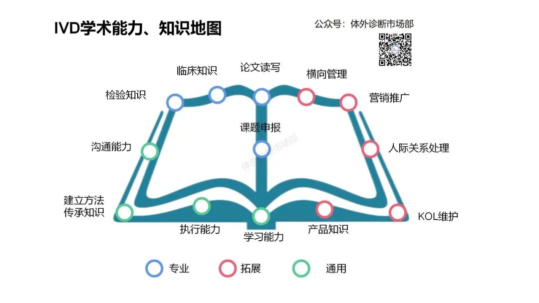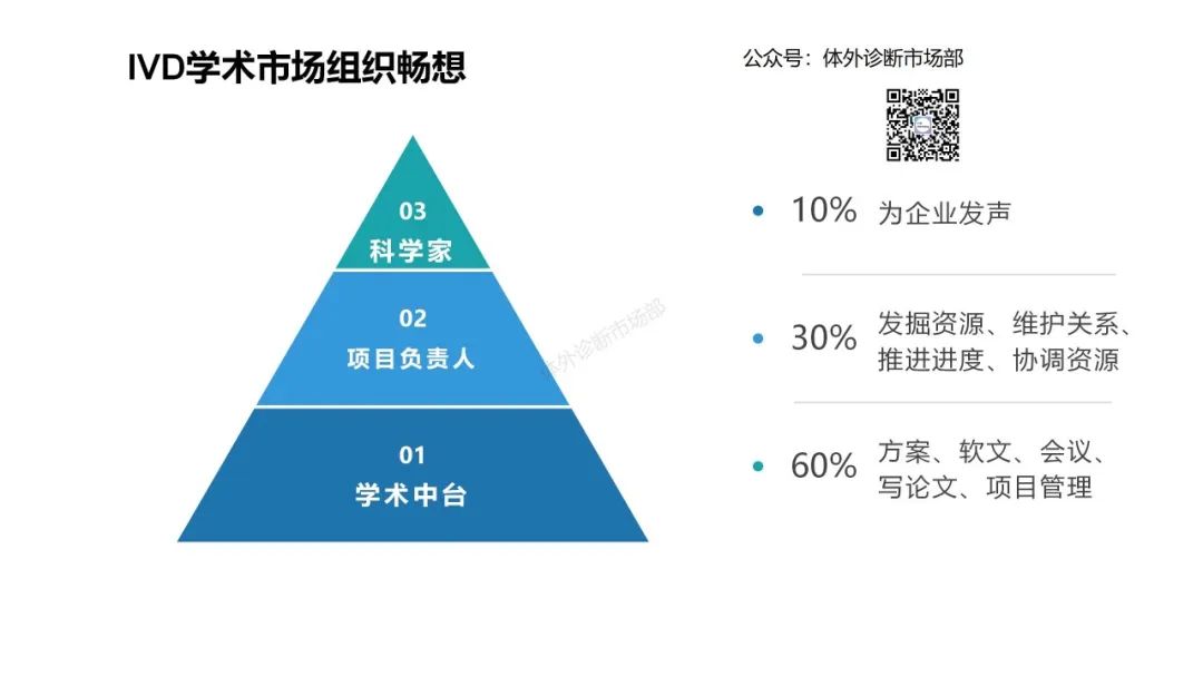 学术为何难招? 本文学术定义:包括依托产品发现创新科研方向、客户筛选洽谈、合同课题方案撰写、院内立项伦理人遗流程促进、学术发布活动策划执行、专家维护、学术营销内容输出、课题方案推进、论文撰写发表等都可包含在本文中的“学术”中。 最近招学术,发现学术是一个比较玄乎的职能,大家常认为,学术可能需要以下的能力: 通用能力知识,如沟通、执行、横向管理、快速学习。 专业能力知识,文献阅读,论文课题撰写,临床知识,实验设计知识,课题申报。 但有一些不在上述要求中的隐藏技能,有了这些技能才能真正做好学术工作。 之前写过一篇五步做好IVD学术工作, 其中各部门配合的工作,就是需要的隐藏技能。比如维护专家关系、营销推广、人际关系处理,争取内部资源等。 举个例子,去年面试的一位市场经理,学术工作都是做过的,但是深入提问发现,科研方案是医学部门做,对接专家是区域同事做,方案和平台适配是研发同事谈,执行实验是技术应用做,文章医院老师写,成果发布品牌同事做。说来说去没有一项特别深度参与的。 分工就好招! 要求少了就能招到,比如医学部又可分为(名字各异随便起了一套):