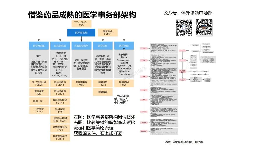 这样架构布局下来,估计要有个8-10人。当然原料生命科学的还是有所不同,更多人贴近学术。也调研来业内知名学术企业学术或叫医学部规模(多数不含开会办活动的人员): R大(好多人) h司(好多人) k司(30多人) m司(近20人) s司(10+人) 药企医学事务部强大,值得学习 与药企精英们探讨了一下医学事务部经验,总结了以下内容,很值得IVD企业学习。 由于药品研发周期长,临床试验繁琐要求严格,导至医学事务随之壮大,CRO也应运而生。 相比药企,IVD产品有着明显的不同,临床要求低,开发周期短,上市也少有保护期。所以历来是野蛮生长,以快打快。由于现阶段新冠透支,市场降温回归常态,相信学术(医学事务)对IVD企业更加重要。 两类公司需要不同的学术人才 要求越多,候选人越少,越招不到人,招不到人,学术做不起来,成了恶性循环。从用人需求到候选人,形成割裂。是对学术部门定位不清。 把学术看成一种服务产品,从客户倒推学术组织定位,更容易看清楚。 和IVD公司相关的学术服务,按产品可以分为:第一种,学术提升;第二种,生产工具。 学术提升型(为名) 客户的需求主要是:发大文章、评高职称、申请大课题。提供产品服务的厂家多为生命科学公司。生命科学接触凭借公开信息猜测。 比如华大的时空组学,目前来看就是发文章用的。佩服一下,芯片大到连人脑切片都能装得下。这部分可以把学术工作目标简单看做文章课题数量,行业内华大毋庸置疑在国内做得是比较好的。 2023自然指数公布:华大位居全球第五&连续八年亚太第一!生命科学产品和服务的客户主要是高校、医药企业、部分医院实验室等。 这些客户的收入均不来源于生命科学产品,但学术搞起来有助于他们拿到更多经费,能提高影响力。 厂家与客户关系方面,不靠这产品吃饭,与厂家的关系就比较单纯,更有可能进行纯学术的碰撞。 课题的方向上,纵向课题比较多,一般发大文章要求创新、逻辑连贯、解决临床问题、合规。各方面都做好是个系统工程,基本都属于纵向研究。能够做好一次可能运气好,持续做好难上加难。 所以很多投机取巧的方式,比如新工具应用,新分析方式应用,新队列测新指标渐进式的应用。 和自媒体一样,写本书憋的时间太长,不如变成每章发一篇软文;写文章也是一样,分子层面、转录层面、蛋白层面、细胞层面、组织层面最后病例层面掰碎了写,可能发完系列文章直接就够评教授了。 当然我文献看得不多,就不细讲。 厂家的输出方面,能买得起这些产品服务也代表有一定科研能力,有自己的学术思路,厂家的学术工作可以配合和输入为主,如何“套”一些公司客户发的大文章,又有哪家客户利用这项技术申请了课题等。 生产工具型(为利) 这一类包括了能进入检验科的大部分IVD产品,血球生化免疫凝血,分子里面一大部分。这一类是生产工具。客户是收临床样本,出报告的各类实验室。 客户关注点也比较实际,影不影响奖金和收入、能不能按时下班、临床是否投诉、没事别总坏、最好自动化不用管。好比是拖拉机,要省油,适应各种地形,不容易坏,坐着舒服,是一个道理。 厂家与客户关系方面,做学术的前提需要满足以上需求,附带一些个人喜好,和对支持力度的要求。往往对厂家提出更高的要求,很多隐性能力,就是在学术能力碰壁情况下发挥作用。 课题的方向上,横向课题比较多,IVD卷成这样,能有心思做学术的厂家就不多,无限制投入更不可能,KPI还要增加投入产出比。 客户使用生产工具和厂家要活下去的目标相互冲突,也提示了无法像科学家一样做个几年研究没有成果。 所以最好就是短平快课题,短平快包括了比对、验证、参考范围、更新指南共识等。 挖掘课题方向可能要对疾病有更深入的了解,方案才能创新和落地。 另外,已经到了应用层面,很多课题都是排他的,因为涉及到课题费用是厂家赞助,多个厂家参与,赞助谁多谁少很难平衡,也导至了要想从蛋白层面研究到分子层面,多组学课题难度大。 厂家的输出方面,有时厂家需要主导学术活动,如果想借应用层面的学术成果提升影响力,想到两种方法: 高举高打,能帮国民提高救治率、帮国家省钱、帮医院提高医疗水平和少走弯路。 逆流而上,通过大样本队列的分析得到创新成果,回溯到组织层面、细胞层面、最终走到分子层面。 高举高打就比发文章难太多了,逆流而上需要很多资源。 比如搞定低发病率或特殊组别的阳性样本,跟踪随访整个队列好几年。都需要很大的投入。 另外,很多客户被提高影响力的科研活动占用了大量时间,这种短平快的项目兴趣不高,时间不充裕,所以还要求提供如实验方案和操作,课题申报,文章撰写等。 做到保姆式服务。 当然科研合作也能外包,不过外包的话还需要学术同事做什么呢。 两类学术服务,对厂家来说有着相同的目的。是得到专家背书产品,得到数据支持应用,得到曝光增加影响。所以要求学术同事们也能带有营销的思维和目的性。 两种学术工作异同比较表