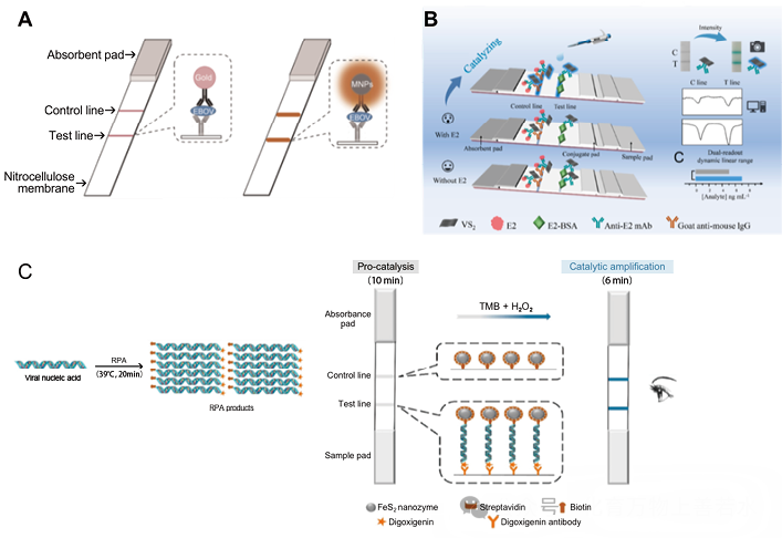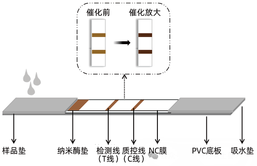 作者:邹思家 罗亚莹 段德民 高利增 【摘要】纳米酶试纸条层析技术是一种新型的固相免疫检测技术,是将传统试纸条中的胶体金替换成纳米酶。纳米酶具有低成本、高稳定性、生物相容性等特性,使其在疾病诊断、食品安全、药物残留等方面被广泛应用。近年来,国内外研究人员对纳米酶试纸条层析技术的研究越来越多,本文对纳米酶试纸条层析技术的原理、分类、检测类型和应用前景进行了综述。 【关键词】纳米酶;免疫层析;诊断;应用 纳米酶试纸条层析技术(Nanozyme strip)是以纳米酶作为标记物检测特定抗原或抗体的固相免疫标记技术。它不同于传统的胶体金试纸条检测技术,除了具有操作简便、快捷的特点,纳米酶因其类酶活性,可使底物显色信号放大,增强灵敏度。纳米酶具有与天然酶一样的催化效力,并且比酶更稳定,阎锡蕴院士团队在2015年研制出一种有效检测埃博拉病毒的纳米酶试纸条新技术,该技术解决了传统试纸条法因灵敏度低而长期应用受限的瓶颈问题,有望成为控制埃博拉传播的利器[1]。目前,纳米酶试纸条技术在医学、化工、食品、农业和环境等领域被广泛研究,并在2018年获得转铁蛋白和便潜血检测相关的两项医疗器械注册证。本文主要介绍了纳米酶试纸条层析技术原理、分类、检测类型以及在各个领域中的应用前景。 一、纳米酶试纸条层析技术及原理 1. 纳米酶:纳米酶(Nanozyme)是一类本身蕴含类酶特性的纳米材料,是新一代人工酶,具有多种酶模拟活性、高稳定性、独特的表面化学性质、易于表面调节和生物相容性等诸多优点,它克服了天然酶制备困难、成本高、易失活等问题。自2007年被首次报道以来[2],已有近千种不同组成的纳米材料被发现具有类酶活性,以金属、金属氧化物、金属有机骨架为基础的纳米酶已被用于生物传感系统的开发,利用纳米材料的物理化学性质为即时检验(point-of-care testing,POCT)技术的发展提供了新思路。 2. 纳米酶试纸条层析技术原理:纳米酶试纸条层析技术是以纳米酶作为检测探针,利用其类酶活性、磁性等特性应用于抗原抗体反应的一种新型检测技术。其原理是将己知的特异性抗体(抗原)固定在硝酸纤维素膜上作为检测带,将与之配对的另一个抗体(抗原)与纳米酶进行偶联,形成纳米酶-抗体(抗原)复合物作为检测探针,当加入待检样品后,若样品中含有待检物,首先会被探针捕捉,形成抗原抗体纳米酶复合物,随着层析液继续向前泳动,到达检测线与包被抗体(抗原)发生高特异性和高亲和力的免疫反应,产生一条明显的检测带,多余的探针则继续向前到达质控线被捕捉。若样品中不含目标分析物,则与纳米酶探针一起到达质控线。最后经酶信号放大进行定性或半定量分析的检测过程(图1)。 二、纳米酶及其显色/发光类型 近年来,越来越多的纳米酶被发现具有多种类酶活性如氧化酶(Oxidase, OXD)[3]、过氧化物酶(Peroxidase, POD)[4]、过氧化氢酶(Catalase, CAT)[5]、超氧化物酶(Superoxide Dismutase, SOD)[6]等。纳米酶在不同条件下可以表现出不同的类酶活性,并且不同纳米酶对不同底物的亲和力也不相同。因此,为了让纳米酶试纸条检测灵敏度提高,常常需要针对不同纳米酶选择其最适底物以达到最佳催化效果,应用到即时检验中。不同纳米酶表现出来的不同类酶活性及其在体外检测中的应用见表1。由表1可见,纳米酶能选择性的检测多种标志物,以类过氧化物酶应用最广泛。常用比色法进行酶信号放大提高试纸条检测灵敏度,除此以外,化学发光、荧光法也有涉及。 三、纳米酶试纸条层析技术的检测类型 纳米酶试纸条既可以检测蛋白质(抗原抗体)又可以检测核酸。抗原抗体检测方法主要有竞争法、间接法和夹心法,目前研究最广泛的是夹心法和竞争法。 1. 蛋白质检测:(1)夹心法:夹心法包括双抗体夹心法和双抗原夹心法。纳米酶上标记待测物的单克隆抗体(抗原),检测线(T线)包被针对待测物另一位点的单克隆抗体(抗原),质控线(C线)包被纳米酶标记抗体的二抗。当待测物为阳性样本时,待测物同时与纳米酶标记抗体和T线处包被受体(抗原或抗体)结合形成一个夹心结构,在T线处聚集显色,多余的纳米酶标记抗体继续层析至C线与包被二抗结合而显色。T线和C线均显色为阳性结果;T线不显色,C线显色为阴性结果;T线和C线均不显色为无效结果。阎锡蕴院士团队[1]研制出了快速检测埃博拉病毒的四氧化三铁过氧化物纳米酶试纸条,其灵敏度低至1ng/ml。经二氨基联苯胺(Diaminobenzidine,DAB)显色信号放大后,比传统胶体金法灵敏度提高10-100倍,30min内即可检测出结果。(2)竞争法:竞争法常用来检测抗原分子,纳米酶垫上包被的纳米酶标记抗体或抗原和待测物与T线处包被的抗原或抗体进行竞争性结合。当待测物为阳性样本时,待测物中的抗体与T线包被的抗体可竞争性结合纳米酶标记抗原,导至T线上包被的抗体无法和纳米酶标记抗原结合,则T线无法显色。T线和C线均显色为阴性,T线不显色C线显色为阳性,T线和C线均不显色为无效结果。张道宏团队[7]研制了检测17β-雌二醇的二硫化钒过氧化物纳米酶试纸条,经3,3’,5,5’-四甲基联苯胺(3,3’,5,5’-Tetramethylbenzidine,TMB)显色信号放大后,最低检测限为0.065ng/mL。而胶体金试纸条检测灵敏度为0.406ng/ml,灵敏度比纳米酶试纸条检测结果高6倍。 2. 核酸检测:核酸试纸条是近年来试纸条层析技术中的新热点