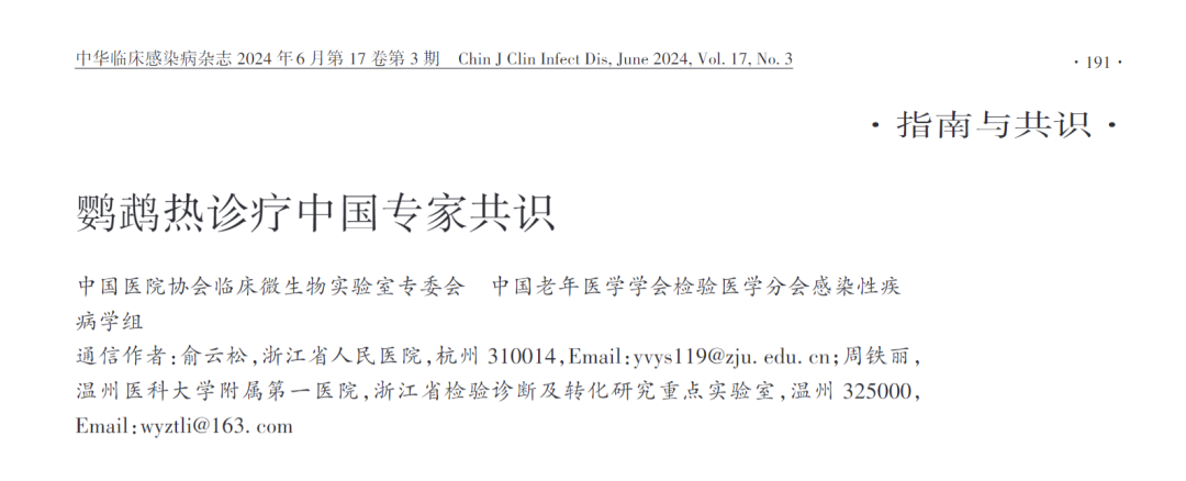 鹦鹉热是一种由鹦鹉热衣原体( Chlamydia psittaci,Cps)引起的人畜共患病。由于其临床症状与许多呼吸系统感染性疾病相似,缺乏特异性,导至该病常发生误诊和漏诊。为了规范鹦鹉热的诊疗方法,帮助临床医师做出合理决策,由温州医科大学附属第一医院和浙江省人民医院共同牵头并组织20余位专家,根据我国鹦鹉热诊疗实际情况及专家临床实践经验,参考国内外最新研究数据、相关指南和文献,制订了本共识,旨在为临床医师和实验室病原学诊断人员提供参考。 通信作者: 周铁丽(温州医科大学附属第一医院) 俞云松(浙江省人民医院)
