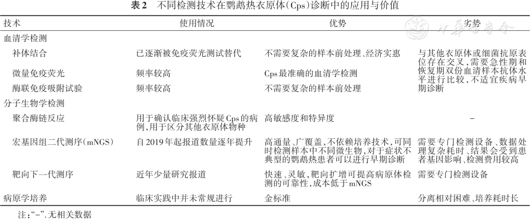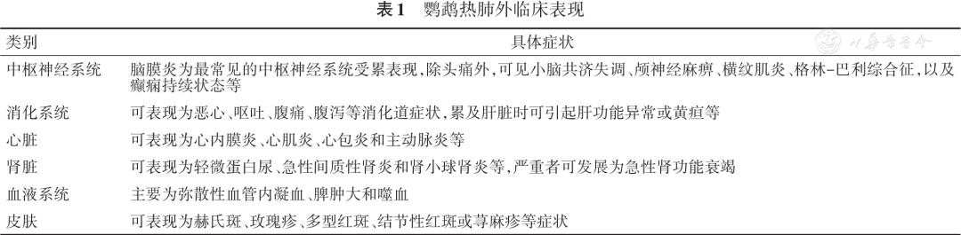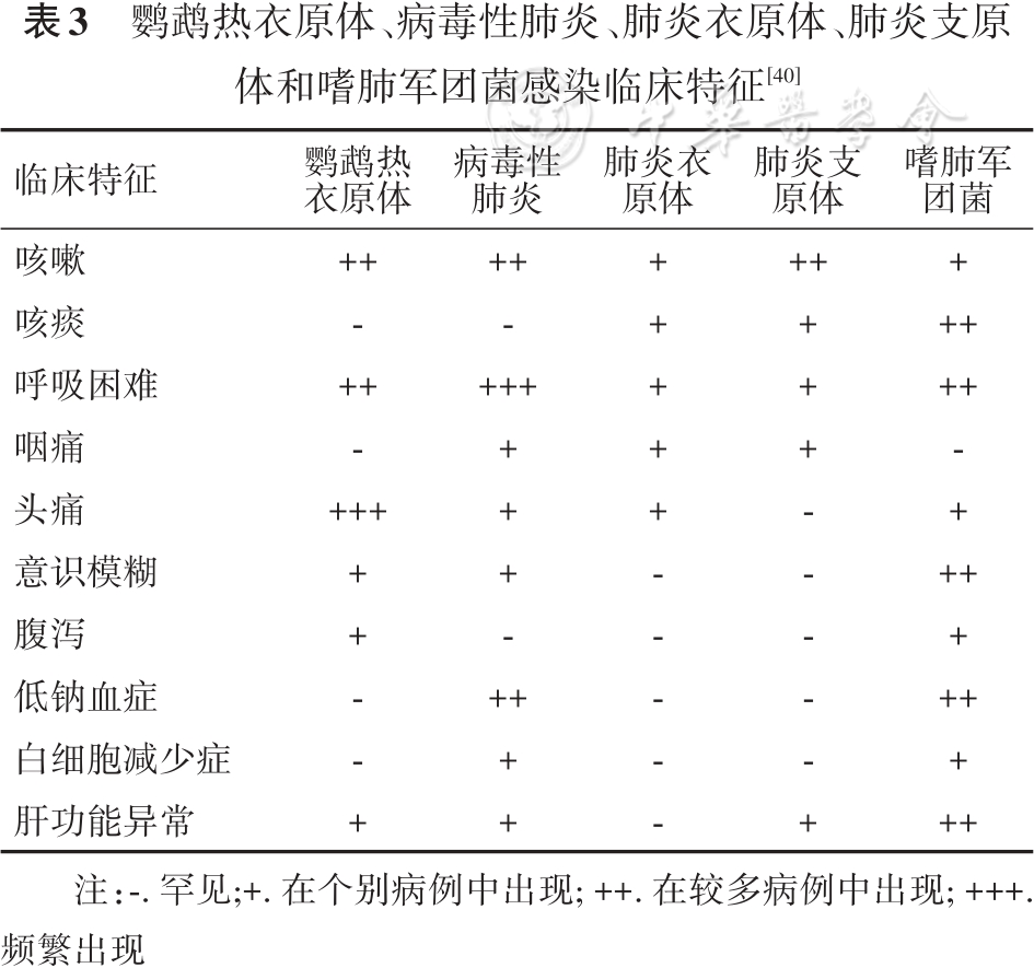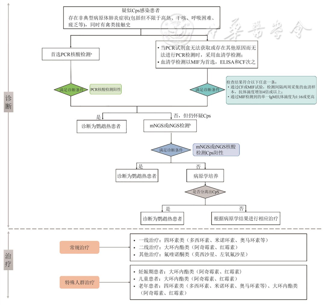 执笔专家: 陈栎江(温州医科大学附属第一医院) 周华(浙江大学医学院附属第一医院) Cps属于细菌,衣原体门,衣原体纲,衣原体目,衣原体科,衣原体属,分布广泛且严格真核细胞内寄生,介于细菌和病毒之间,同时含有DNA和RNA,具有细胞壁和细胞膜。其细胞壁的结构和成分与革兰阴性菌相似,含有属特异脂多糖抗原,但没有或仅有微量胞壁酸。 Cps对理化因素抵抗力不强。在70%酒精、2%来苏水、2%氢氧化钠、1%盐酸和3%过氧化氢溶液中,几分钟内即可失去感染力。0.5%石炭酸、0.1%甲醛液和75%酒精作用30min可将其杀灭。相比高温条件,Cps对低温的耐受力更强,在56℃条件下5min,37℃条件下48h可被灭活,但在-70℃环境下可存活数年。此外,在干燥的外界条件下可存活5周,在室温和日光下最多能存活6d,在水中可存活17d,并且紫外线对衣原体有很强的杀灭作用。 Cps的主要传染源是鸟类,如鹦鹉等,以及禽类如鸡、鸭、鹅、鸽子等;另外,哺乳动物也可能成为潜在的传染源。此外,鹦鹉热被认为可能在人与人之间传播,但非常罕见。 呼吸道传播 人类一般通过吸入受Cps感染的鸟类或禽类的尿液、粪便或其他排泄物污染的气溶胶而感染。 接触传播 接触被病原体污染的环境,或密切接触受感染鸟类或禽类及其羽毛、组织、分泌物、排泄物等,或被感染的鸟类啄伤、抓伤时也可能经由破损皮肤、黏膜,以及消化道途径引发感染。 人群普遍易感,感染后不能获得持久免疫,易复发及再次感染,以下人群是本病的高危人群: (1)接触鸟类或禽类:从事鸟类或禽类相关工作或饲养人员以及鸟类爱好者,具有更多的接触机会,可能造成Cps集体感染或家庭聚集性感染。 (2)接触鹦鹉热患者:接触鹦鹉热患者也可能感染Cps。 临床表现 / CLINICAL MANIFESTATIONS Cps侵入人体后,潜伏期一般为5~14d,但可短至3d,亦可长达45d,传染期通常在出现症状后7~8d。该病的严重程度从轻度非特异性疾病到全身性疾病,伴有严重肺炎,很少导至死亡。典型的临床症状为高热、咳嗽、呼吸困难、疲乏、畏寒、头痛及肌肉酸痛等,器官损害以重度急性呼吸窘迫综合征(ARDS)及休克为主要表现,少部分患者病情进展迅速,可引发多器官或系统表现。 以Cps肺炎最为多见,患者常表现为干咳,较早出现肺部实变体征,也可出现肺部啰音。重症鹦鹉热患者可于短期内出现呼吸衰竭和ARDS等呼吸系统症状。 鹦鹉热患者临床症状多样,包含肺炎、肝炎、肾脏功能损害等表现。 妊娠中晚期感染Cps可能会导至孕妇发生危及生命的并发症,如呼吸衰竭、肝功能不全和弥散性血管内凝血(DIC)。同时,Cps还可能穿过胎盘屏障,在胎盘内大量繁殖,引起子宫胎盘灌注损伤,导至宫内胎儿窘迫和流产。 鹦鹉热的临床表现缺乏特异性,当患者有发热和/或呼吸系统症状表现且具有相关鸟类或禽类接触史时,应重点针对Cps进行筛查和诊断,提早干预从而防止Cps经血播散累及其他器官/系统。 临床检查 / CLINICAL EXAMINATIONS 鹦鹉热诊断需结合患者的临床表现(CAP症状或流感样症状,肺部浸润影、流行病学史)、接触史(部分患者接触史不明)和病原学结果综合判定。其中病原学结果常见检测包括血清学检测、分子生物学检测和病原学培养。 鹦鹉热常累及肺组织,影像学检查虽然不能直接确诊,但可以快速明确感染部位及病灶范围,为临床诊疗提供依据。 对于疑似鹦鹉热患者,首先推荐采用核酸检测方法,如PCR进行病原学检测;当不具备核酸检测条件时,推荐使用血清学抗体检测方法进行病原学检测。 不推荐使用血清学抗体检测方法独立确诊或排除Cps感染;当血清学检测结果阴性但仍不能排除感染时,建议进一步采用BALF进行mNGS或tNGS检测。 对于临床症状不典型或PCR检测结果阴性且不能排除Cps感染的患者,推荐采用BALF进行mNGS或tNGS检测;对于支气管镜检查不耐受的患者,可采集痰液或其他呼吸道样本进行检测。 分离培养法培养条件苛刻且耗时长,不建议在临床实验室常规开展Cps的分离培养。 胸部X线和胸部CT对于鹦鹉热的诊断特异度低,不推荐作为鹦鹉热的确诊依据,可以用于辅助诊断和鉴别诊断。 流感样非典型肺炎症状和禽类暴露史是进行Cps临床诊断的主要依据。具有以上流行病学史、临床和影像学表现的疑似患者,且符合下列至少1项即可诊断为鹦鹉热: (1)从呼吸道样本或血液样本中分离出Cps; (2)通过CF或MIF试验检测间隔2周采集的血清样本抗体水平增加4倍或以上; (3)通过MIF检测到的单一IgM抗体滴度为1∶16或更高; (4)通过PCR或mNGS或tNGS在呼吸道样本或血液样本中检测到Cps核酸阳性。 鉴别诊断 / DIFFERENTIAL DIAGNOSIS 鹦鹉热需与流行性感冒、伤寒、其他病原体肺炎,以及其他感染性疾病做鉴别诊断。 鹦鹉热缺乏特异性的临床表现,须与流行性感冒、伤寒,病毒性肺炎、细菌性肺炎,以及肺炎支原体肺炎等鉴别。 常用的Cps抗菌药物包括四环素类、新型四环素类衍生物、大环内酯类和氟喹诺酮类等药物。由于Cps无典型的细胞壁,常用的青霉素和头孢菌素等β-内酰胺类抗菌药物对其无效。