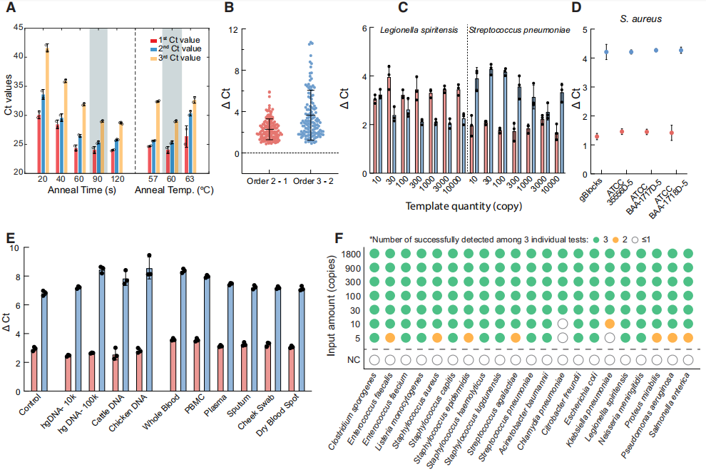 作者下一步验证一个菌种下不同菌株之间的自然变异是否会对CCMA试验产生影响。结果显示,三种独特金黄色葡萄球菌菌株之间有着高度一致的ΔCt值(图D)。这验证了CCMA普遍识别目标物种的可靠性。