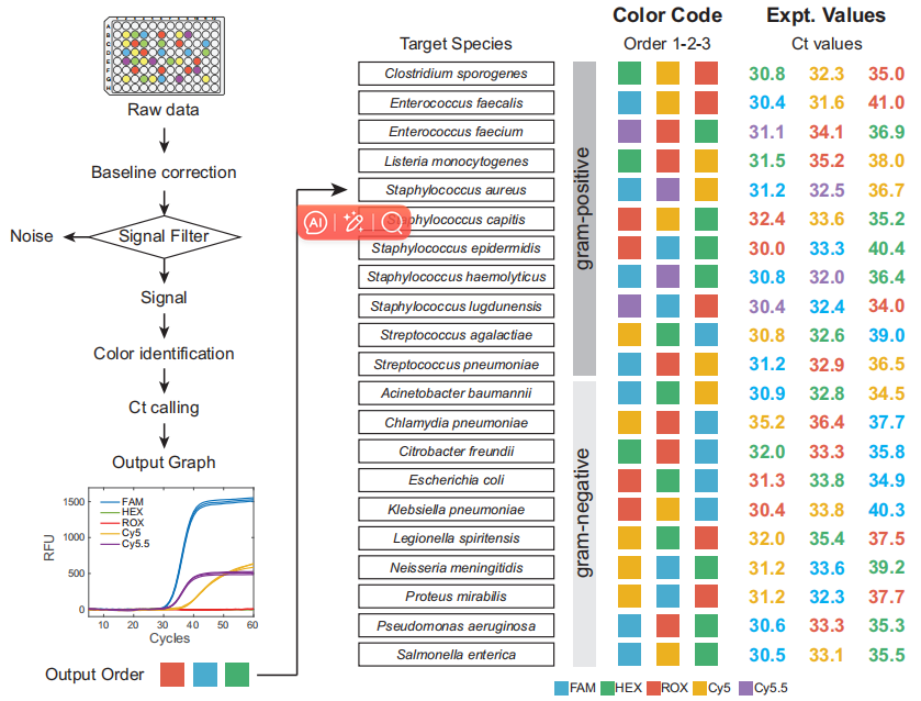 高度多重PCR平台,如BioFire FilmArray,已经在一些应用中得到采用。然而,与qPCR相比,这些仪器需要定制耗材、缺乏病原体DNA定量等原因,限制了它们的应用范围和对临床实践的影响。相比之下,定量PCR (qPCR)仪器系统广泛应用于世界各地的许多临床实验室和医院。标准qPCR仪器平台和检测具有有限的多路复用能力,只能使用4到6个荧光通道。研究人员一直致力于创造新的方法来增加qPCR的多样性。