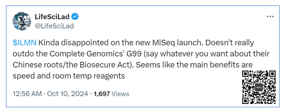 我们对于Illumina的新产品推测看来基本是准确的。 在2024年国庆节期间,我们对Illumina新产品“偷袭”做了一个推测。 今天,终于到了兑现的时候。 还好,错的不算离谱。 先说结论:牙膏挤爆,这是一款(其实是两款)全面对标并试图超越华大智造DNBSEQ-G99/E25的产品。 #01 先看东西 这次推出的产品,被称为MiSeq i100/i100 Plus,时隔10余年Illumina终于想起来升级MiSeq了,他真的,我哭死。 在此之前,遍观Illumina测序仪在低通量领域能与华大智造DNBSEQ-G99打个平手的是没有的。 在病原微生物检测tNGS/mNGS领域,G99几乎是断层式领先。 我想,这也是本次MiSeq i100牙膏挤爆的原因之一。 与常规的Illumina玻璃基测序芯片不同,这次Illumina MiSeq i100采用了CMOS芯片。 为了适配CMOS芯片,Illumina还对XLEAP-SBS生化系统进行了调整和优化。 最终的结果就是更好的测序数据质量和更快的测序速度。 适配MiSeq i100/i100 Plus的芯片一共有四种,但是目前能买到的只有5M和25M两款。 跟库克一样,也是刀法精准,更大的50M和100M芯片只能MiSeq i100 Plus机型可以用。 这里还有个细节,我们在后面会提到。 如果我没看错,为了追求速度Illumina的MiSeq i100系列用的是单芯片配置,并没有像G99一样用的是双芯片。 数据质量方面,在PE300的模式下将Q30推进到 了90%以上,话说那个显眼包MiSeq是认真的吗... 不过,现在似乎是Q40年代了,我们拿一个华大智造DNBSEQ-G99的PE300实测数据来看下。 嗯,还是有点差距,Illumina还需要努力啊(误)。 当然,Illumina可能还在挤牙膏,或者给我挖坑,咱们可以蹲一下实测数据。 哦,对了,还有板载的DRAGEN分析系统,彻底贯彻CEO Jacob的End-to-End战略以及更加环保的试剂。 嗨,谁还没有个板载的分析系统嘛,华大智造的DNBSEQ-E25/G99哪个没有... 不过,Illumina MiSeq i100在易用性上确实有独到之处。 通过将芯片及复述测序试剂集成,真正做到了Load-and-Go~ #02 对标了谁? 战略上看: 拿下Fluent BioSciences,Illumina最新战略意图隐现 很明显,Illumina自收购Fluent BioSciences布局单细胞领域就开始对标华大智造了。 今天,在测序仪上的一大步,更是明确了这一点:就是要对标华大智造。 虽然不太敢相信,但是这看起来就是一个事实。 这是2007年Illumina收购Solexa 17年后一个重大的转变标志。 从来Illumina都是测序仪创新的引领者,而这一次,攻守之势易也。 产品上看: Illumina这次鸡贼的一点是其实发布的是两款产品但是看起来像是一款产品,其中以i100来打华大智造的E25,以i100 Plus来打华大智造的G99。 我们来看一个细节: 目前根据公开资料i100 5M芯片是不支持SE100模式的,而最大的100M芯片也是不支持PE300模式的。 怎么样,有意思吧? 也许华大智造DNBSEQ-G99/E25在发布之初也没想到,自己竟然会被巨头如此“关照”。 时代,真的变了。 #03 时移世易 非常明显的是Illumina i100想要切的市场,就是以临床检测为主,包括tNGS/mNGS和肿瘤小panel。 不过这个难度是有一点点大的,起码在中国市场是这样的。 在2023年9月华大智造G99公开的信息就有超过14家合作伙伴,时至今日已经开花结果。 我们可以看到,有不少“Powered by G99”的获得医疗器械许可证的产品推向市场,已经形成了合力。 毫无意外,G99也成了华大智造的明星产品之一。 至少在华大智造的半年报中,G99的增长喜人,甚至有点逆天。 各位可以翻下当时的这篇:G99获批多国IVD“通行证” 华大智造已经不是那个只有一两个产品、零星几个客户的“小透明”了。 (援引自华大智造公众号) 我们从Illumina此前的战略上来看,临床领域无疑是重点。 在美国,由于众所周知的原因华大智造一直不能大展拳脚。 但是在国内,华大智造的势已成了。 怎么样,是不是觉得“DNBSEQ inside”在未来也不是不可能。 #04 押注未来 我们总结下这2款产品: 第一,这是目前Illumina已知测序速度最快的产品,与两年前推出的华大智造E25/G99基本持平(别忘了G99 2.5小时的SE40),且G99拥有PE300 Q40超80%的优势;; 第二,MiSeq i100系列的易用性也是目前做的最好的产品,这没得挑; 第三,MiSeq i100意图切入的市场是华大智造DNBSEQ-E25/G99主打的临床应用市场,相应的华大智造G99已经有超过20国家地区的资质认证,难度不小; 第三,在低通量市场,华大智造的E25/G99大势已成,合作伙伴众多,Illumina要啃下来面临不少挑战。 第四,Illumina“刀法精准”。 第五,时代变了,MGI成了巨头对标的对象。 由于Illumina并没有公布试剂的价格,这却是市场最为关注的点,这一点我相信没有比国产厂商控成本做的最好的了。 而且,Illumina目前正在向以利润为主要目标的公司转变(个人观察,不一定对)。 不能说这是错的,毕竟企业盈利是天职,而且股东获得了回报。 但是,与苹果并不相通的是Illumina面对的是专业消费者,是一群需要开拓新世界的科学家,是一群企图治愈绝症的前沿医学研究者。 这意味着什么,不需要我多说。 海外也有一些有意思的评价,咱们就不展开了。 另外,除了面对国内华大智造的强大压力,美国本土其压力也不小。 最近Element Biosciences正在为其Trinity技术和AVITI24平台造势,Singular Genomics收到了至少两家机构的收购意向,Ultima Genomics与Myriad又勾勾搭搭... 这一切,无不预示着这个庞大的帝国面临的竞争压力。 要是哪一天地缘政治紧张消退,那...不敢想,会笑醒。 当然,我们仍然期待Illumina拿出更有诚意的创新产品来。 比如,苹果的芯片、英伟达的GPU或者是特斯拉的屏幕换挡(误)。 需要明确的一