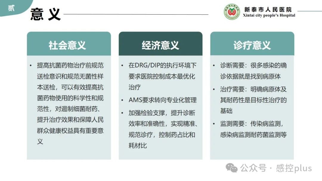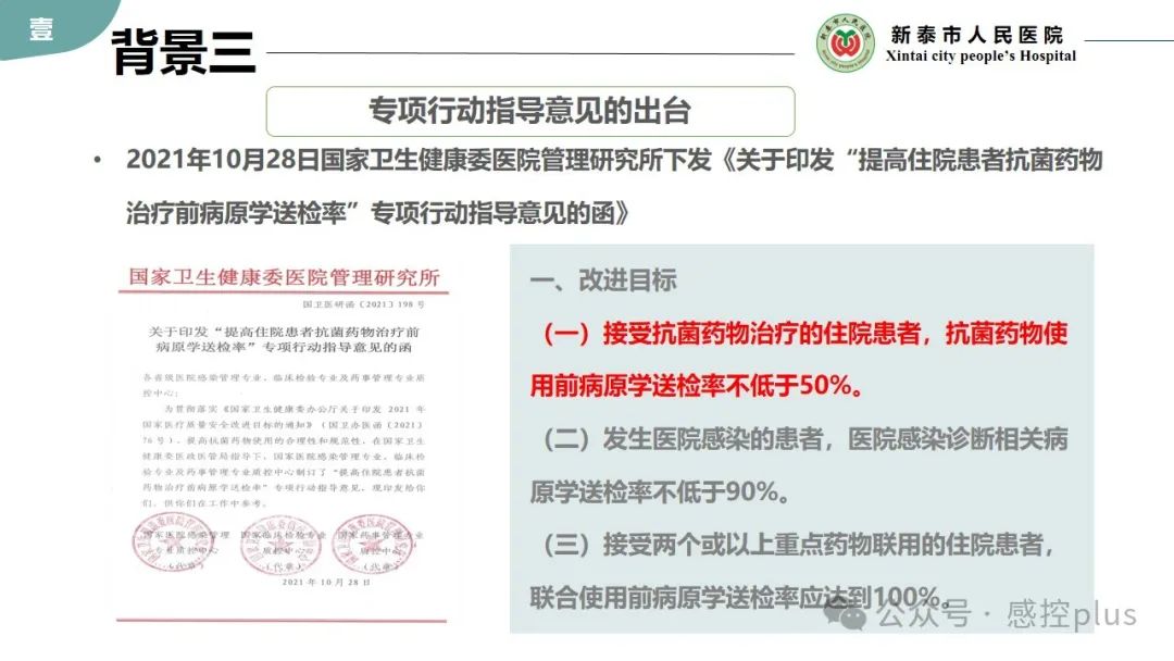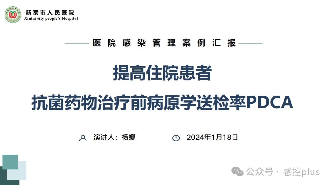 导 读: 抗菌药物治疗前病原学送检率是医院感染管理中的重要指标之一。通过合理提高抗菌药物治疗前病原学送检率,可以有效指导抗菌药物的选择和使用,提高治疗效果,减少细菌耐药性的产生,提高医疗质量和患者安全。PDCA是一种持续质量改进的管理方法,那么,如何将PDCA应用到抗菌药物治疗前病原学送检管理当中,以提高抗菌药物治疗前病原学送检率? 2024年感控plus V讲座第3讲,感控plus特邀山东省新泰市人民医院杨娜老师带来“提高住院患者抗菌药物治疗前病原学送检率PDCA”的主题讲座,希望对各位老师关于抗菌药物的管理能有所帮助和参考。分享讲者PPT: