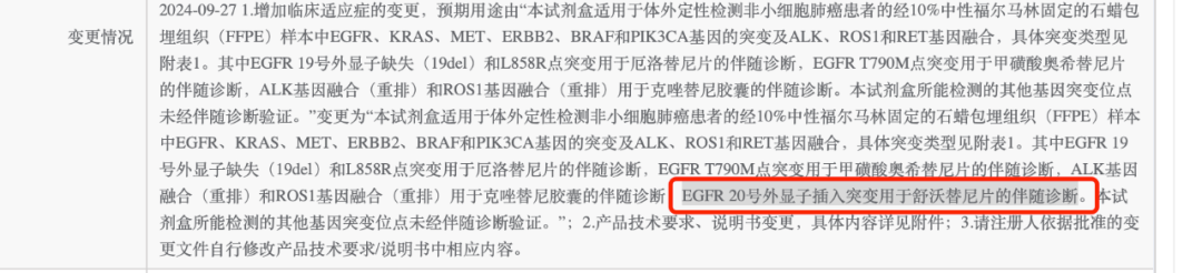 很快,机会来了。 舒沃替尼,是迪哲药业针对EGFR exon20ins突变的创新产品。 2021年7月,其在中国的注册临床“WU-KONG6”启动入组。 作为一个单臂试验(SAT),所有入组的患者均经过了认证实验室或中心实验室确认携带EGFR exon20ins ——方法学是NGS或rt-PCR,后面我们也知道了,其中NGS用的是燃石的9基因试剂盒。 当然那会儿这个试剂盒也还没获批 ——是的,这也是一个“与抗肿瘤药物同步研发的原研伴随诊断试剂”,肺癌NGS中的第一个。 2022年3月,试剂盒率先获批,EGFR 20ins被列为二级位点。 一年后的2023年8月,舒沃替尼片的非小细胞肺癌EGFR exon20ins适应症获批。 这一次,我们又等了一年。 2024年10月9日,NMPA在线更新了“人类9基因突变联合检测试剂盒(可逆末端终止测序法)”的预期用途: EGFR exon20ins成功从二级位点“升级”为一级位点,作为舒沃替尼的伴随诊断。 第二扇门,也被推开了。 燃石,成功跑完第二棒。 03 “队友和对手” 第二棒是终点吗? 当然不是。 “可升级”的接力赛还有至少两程: