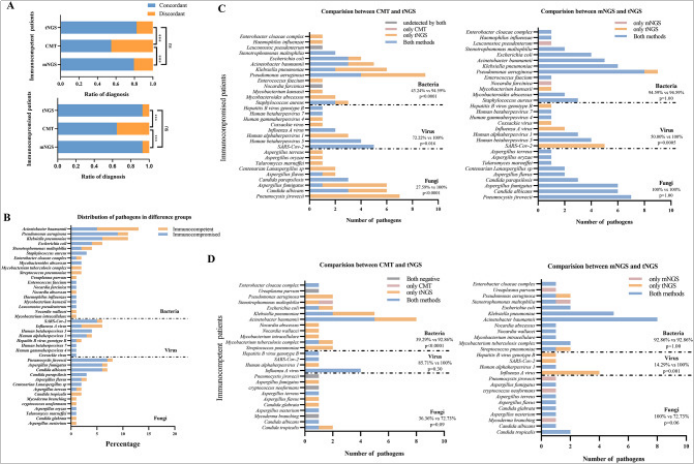 近日,上海交通大学医学院附属仁济医院的李敏教授团队在Annals of Clinical Microbiology and Antimicrobials (JCR分区Q1)发表了关于评估捕获法tNGS在免疫低下的下呼吸道感染患者中临床应用价值的研究成果。该研究基于吉因加探针杂交捕获的 tNGS panel,对下呼吸道感染患者进行了回顾性分析,评估了tNGS与临床诊断的一致性。研究结果证实tNGS技术在辅助临床诊断和提供抗感染治疗指导方面展示了其重要性和潜力。吉因加将携手仁济医院检验科分子诊断平台在未来进一步探索tNGS方法在更多临床场景下的应用潜力和价值,为该技术的广泛应用提供坚实的证据支持。 随着免疫抑制剂使用的增加,越来越多的人出现免疫功能障碍,导至危及生命的事件(尤其是感染)的风险增加,下呼吸道感染(LRTI)是全球免疫功能低下个体死亡的主要原因,由于此类患者感染的病原体的复杂性,可能需要结合各种检测方法, mNGS方法成本高,目前更常用于重症监护病房(ICU)和危重患者。tNGS方法成本效益高,前期研究表明tNGS在鉴定LRTI病原体方面表现出与mNGS相似的敏感性和特异性。因此该研究旨在通过比较tNGS与mNGS和传统的微生物检验(CMT)的性能来评估tNGS在免疫功能低下患者中辅助诊断LRTI的临床表现。 本研究回顾了197位既往就诊于仁济医院的免疫低下的可疑下呼吸道感染患者,最终纳入88名符合研究要求的患者进行分析,所有患者前期都进行了mNGS检测和传统的微生物检验(CMT)。 图1:研究设计 tNGS在所有患者中的诊断价值 首先比较了tNGS与mNGS以及CMT的临床诊断价值。以临床诊断为参考, tNGS和mNGS的诊断敏感性分别为90.48%和88.09%。tNGS与 mNGS的诊断准确性相似(88.64% 和 87.50%),但高于CMT和培养(60.23% 和 44.32%)。无论是单纯感染还是混合感染,tNGS都表现出比CMT更高的诊断一致性。 在病原体检出比较中,tNGS检测出的病原体数目最多,显著多于mNGS。这主要得益于tNGS的DNA和RNA共同检测,而mNGS仅进行了DNA检测。 tNGS不仅额外检出了RNA病毒,而且对SARS-CoV-2和甲型流感的分型结果与PCR结果一致。tNGS展示出显著优于CMT的病原体检测能力,无论是细菌、病毒还是真菌。 图2:tNGS 在 88 个样本中的诊断性能 tNGS在免疫功能低下患者中的诊断价值 在免疫低下患者中,tNGS的敏感性为94.33%,与mNGS的92.45%相当,与整体人群的90.48%相当,无显著差异。另外,与CMT比较,NGS方法的诊断准确率显著更高。 免疫低下和免疫正常患者的病原谱存在差异,细菌感染在免疫正常患者中更常见,而真菌感染在免疫低下患者中发生比例更高。与上述结果相似,tNGS比CMT发现更多的病原体(97.62% vs 44.05%,p<0.0001)。与mNGS相比,tNGS几乎发现mNGS检出的所有病原体,除了在tNGS panel之外的病原体。这也提醒我们tNGS的靶向设计会存在罕见病原体覆盖不全的风险。 图3:tNGS与mNGS 和CMT在免疫低下患者中的诊断比较 NGS 对抗生素调整的临床影响 收集了mNGS对所有的患者的病原学诊断和抗生素决策的影响。mNGS对73.86%患者的抗生素选择和决策产生了正向的影响,17.05% 根据结果进行了抗生素的升阶梯、降阶梯或者停用的调整。通过比较tNGS与mNGS的一致性,可以类比发现,tNGS可以对72.72%的患者产生正向的影响,17.05%根据结果进行适当的抗生素调整。 本研究结果表明,tNGS在免疫功能低下的下呼吸道感染患者中具有病原体诊断的潜力。tNGS的诊断性能与mNGS相当,但成本较低,因此可以作为CMT之外的一种辅助诊断的选择。 |