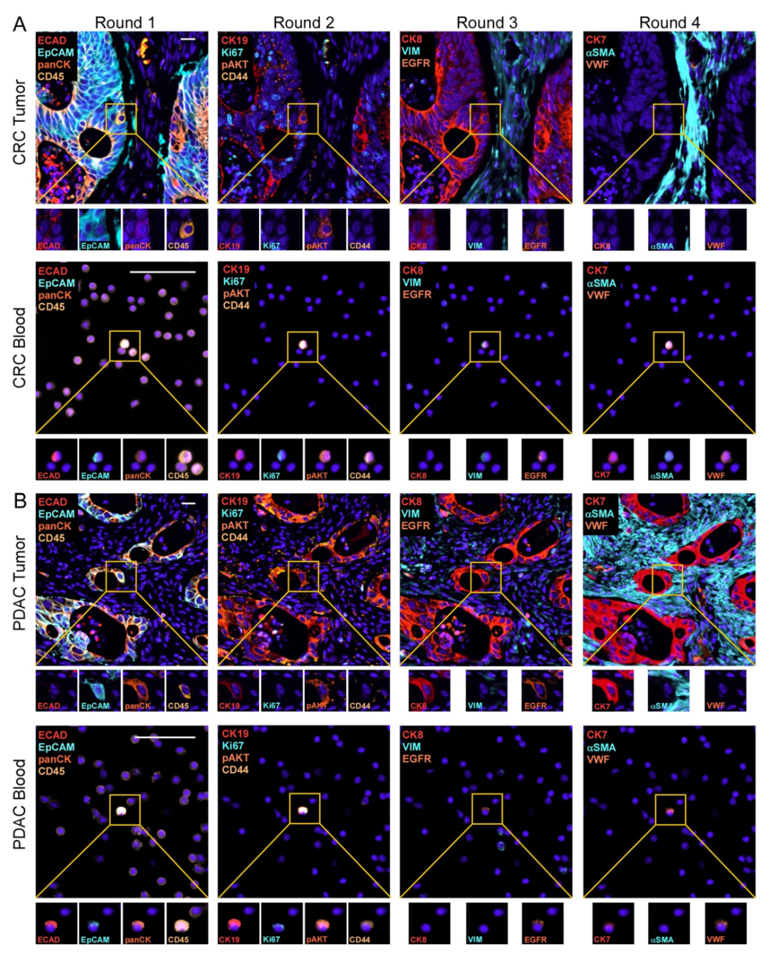 基于Ab-oligo的cyCIF依赖于在每次抗体染色后,依赖UV光从抗体上切割荧光探针,从而产生最小的细胞损失和细胞损伤。此外,基于Ab-oligo的cyCIF平台类似于质谱多路工作流程,因为所有Ab-oligo都是在一个步骤中孵育到组织上,减少了总体实验时间。 全球癌症死亡率持续居高不下,凸显了影响生存的疾病监测和检测方面尚未解决的挑战。开发一种非侵入性的、基于血液的生物标志物将改变癌症患者的生存状况。本文中作者证明了超高含量分析对新鉴定的肿瘤细胞群的功能,这些肿瘤细胞是肿瘤细胞和免疫细胞在患者匹配的肿瘤和外周血标本中的杂交细胞。作者使用允许循环免疫荧光(cyCIF)的寡核苷酸偶联抗体(Ab-oligo),提出了肿瘤和外周血杂交细胞的表型分析。有趣的是,大多数循环杂交细胞(CHC)亚群并未在肿瘤相关的杂交细胞中鉴定出来。这些结果强调了将基于Ab-oligo的cyCIF用于肿瘤和外周血标本的超高含量表型分析的有效性。多重表型分析平台(足够温和,可分析血液,以检测和评估播散的肿瘤细胞)的组合代表了一种探索新型肿瘤生物学的新方法,以及将人群开发为癌症的血液生物标志物的潜在效用。 为了确定肿瘤相关杂交细胞和循环杂交细胞之间是否存在一致的表型,作者首先在患者匹配的肿瘤组织切片和肿瘤切除时采集的外周血样本中确定了深度表型的杂交细胞。作者利用cyCIF进行了多轮抗原染色和成像,并在轮间温和地去除信号,证明这些信号与外周血分析兼容。为了建立混合细胞表型Ab-oligo组合,作者从5个离散类别中选择了抗原:肿瘤表达、免疫细胞、基质、细胞信号传导和功能,以便分析相对于离散肿瘤标志(基质、免疫)的混合细胞特征(即增殖、细胞信号传导状态、表型/功能)。生成相应的Ab-oligo后,作者证明,与常规间接抗体染色(即使用结合荧光团的一抗-二抗)和常规二抗染色检测到的Ab-oligo偶联物相比,每种Ab-oligo (即Ab-oligo+IS)在肿瘤组织中具有一致的染色模式(下图A)。 图注:来自五个表型类别:肿瘤、免疫、基质、细胞信号和功能的代表性生物标志物的Ab-oligo验证 此外,作者评估了Ab-oligo + IS与单纯IS处理的组织以及Ab-oligo + IS染色组织经紫外线处理后的信号背景比。在所有病例中,特异性Ab-oligo信号与背景的比值均大于对照组(即大于1)(上图C)。接下来,作者在一个外周血-人癌细胞系模型上验证了Ab-oligo染色模式,该模型将Ab-oligo添加到从健康受试者分离的外周血单个核细胞(PBMCs)中,以评估抗体对肿瘤或免疫细胞的特异性。与肿瘤组织染色的结果一致,相对于间接抗体染色和Ab-oligo +二抗,Ab-oligo显示出相同的染色模式(上图B)。此外,除VWF不能染色外,所有Ab-oligo + IS组的信号/背景比均大于对照组(即大于1)。 为了在患者匹配的肿瘤和外周血中鉴定杂交细胞,作者将针对CD45(一种泛白细胞标志物)的一小组Ab-oligos,以及含有针对EpCAM、ECAD和泛细胞角蛋白(panCK)的Ab-oligos应用于CRC和PDAC肿瘤组织以及匹配的分离的PBMCs。利用这一组合,作者在CRC和PDAC样本的原发肿瘤和外周血中发现了大量杂交细胞(如下图)。 图注:肿瘤组织和外周血杂交细胞鉴定 接下来,作者在另外三轮染色中对患者匹配的样本应用了经过验证的Ab-oligo组合,以从杂交细胞获得更多的表型信息。在第一轮中,杂交细胞被鉴定出同时表达CD45和至少一种上皮标志物(ECAD、EpCAM和/或panCK)(如下图,第一轮)。在每一轮Ab-oligo染色之间,作者用紫外线处理标本,并重新扫描组织,以确保在进行下一轮染色之前完全清除荧光信号。另外,免疫组织化学染色包括:第2轮(CK19、Ki67、pAKT、CD44);第3轮(CK8、VIM、EGFR);第4轮(CK7、αSMA、VWF)。为了将所有的染色叠加到一张图像中,作者使用QiTissue(一个多重图像可视化和分析软件包)或基于特征的图像配准。这使得作者能够在肿瘤组织和相应的外周血标本中鉴定杂交细胞并对其进行表型分析(如下图)。 图注:在患者匹配的结直肠癌(CRC)和胰腺癌(PDAC)肿瘤切片和血液标本上进行四轮cyCIF鉴定和表型杂交细胞 参考文献: Whalen RM, Anderson AN, Jones JA, Sims Z, Chang YH, Nederlof MA, Wong MH, Gibbs SL. Ultra high content analyses of circulating and tumor associated hybrid cells reveal phenotypic heterogeneity. Sci Rep. 2024 Mar 28;14(1):7350. doi: 10.1038/s41598-024-57381-8. PMID: 38538742; PMCID: PMC10973471. 杭州乐为生医公司 杭州乐为生医公司可提供抗体寡核苷酸偶联技术服务及成品试剂盒。助力您在实验室条件下即可轻松实现Ab-oligo的高效偶联。 技术支持联系电话:18611591243 销售联系方式:19957893538 |