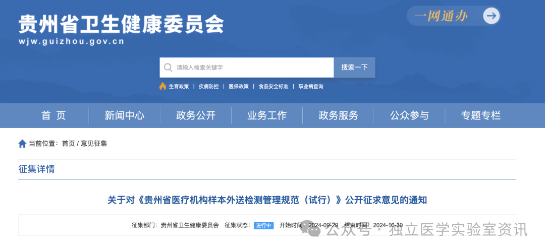 近日,贵州省卫健委发布“关于对《贵州省医疗机构样本外送检测管理规范(试行)》公开征求意见的通知”。