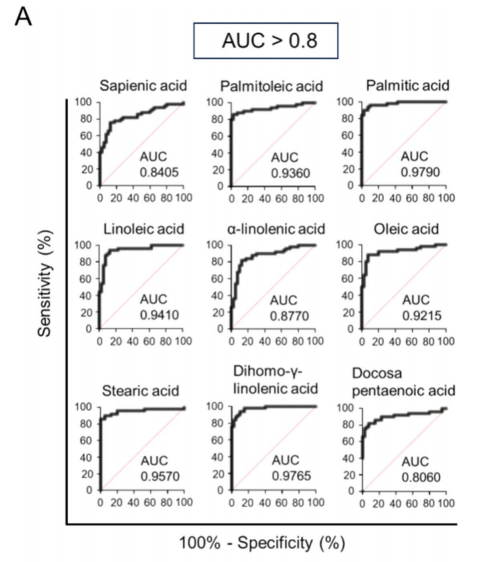 作者下一步研究了这些游离脂肪酸是否对诊断疾病有用。健康供者和CC患者的ROC分析显示,所有脂肪酸都具有较高的诊断准确性(AUC> 0.7),特别是9种FFA具有很高的诊断能力(AUC > 0.8)(图A),且这些血清FFAs的变化与临床分期无关。因此,使用血清游离脂肪酸也有可能对CC进行早期诊断。