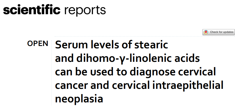 近日,杂志Scientific reports上发表了一篇题为“Serum levels of stearic and dihomo-γ-linolenic acids can be used to diagnose cervical cancer and cervical intraepithelial neoplasia”的文章。在这项研究中,作者发现CC或CIN患者的几种血清FFAs水平显著改变。作者将这些FFAs结合起来,建立了一个高度敏感和特异性的诊断模型。
