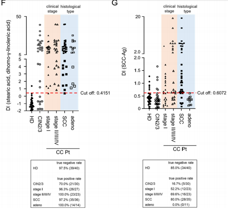 I期CC和CIN2/3患者中硬脂酸、二高-γ-亚麻酸联用模型的真阳性率分别为96.3%和70.0%(图F),比SCC-Ag具有优越的早期诊断能力。此外,联用模型对腺癌的检测非常敏感(真阳性率:100.0%)(图F和G)。这些结果强烈提示联用模型可以独立于临床分期和组织学类型诊断CC和CIN2/3。