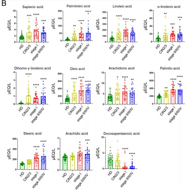 与正常宫颈组织相比,CC组织中脂肪酸合成酶(ACACA、FASN)、脂肪酸去饱和酶(SCD1)和脂肪酸延长酶(ELOVL) 1、3和6的表达会上调。因此,作者首先使用GC-MS测量了健康供者、CIN2/3患者和I-IV期CC患者血清样品中的19种FFA(脂肪酸)。结果表明,与健康供体样品相比,CC样品中10种FFAs的水平显著较高,而二十二碳五烯酸的水平显著较低(图B)。且有8种的FFA水平从CIN2/3开始显著升高(图B)。这些结果强烈提示CC和CIN2/3患者的血清FFA组成与健康供者有显著差异。