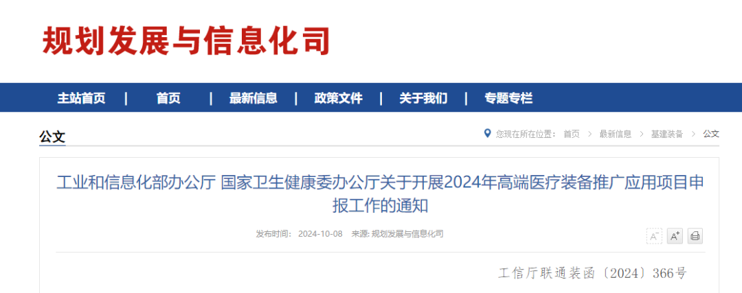 为深入贯彻健康中国、制造强国战略部署,按照《“十四五”医疗装备产业发展规划》部署要求,加快推进高端医疗装备创新发展和推广应用,现就开展2024年度高端医疗装备推广应用项目申报工作有关事项通知如下: