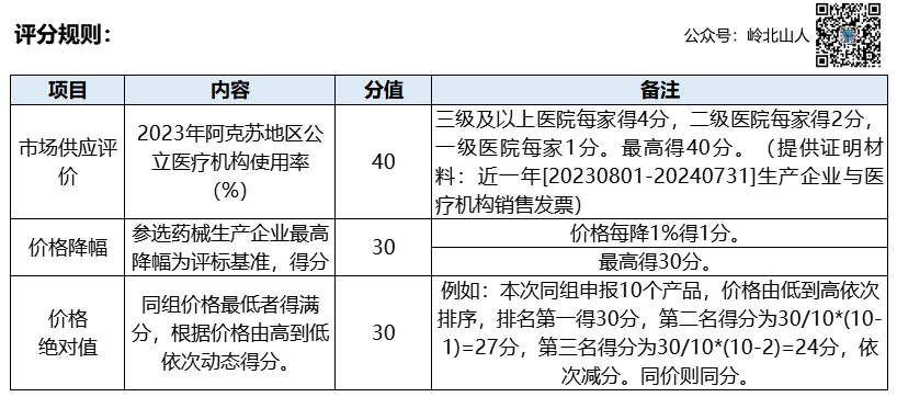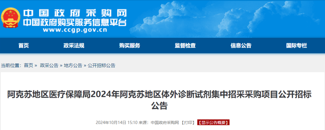 10月14日,中国政府采购网发布消息,阿克苏地区医疗保障局2024年阿克苏地区体外诊断试剂集中招采采购项目公开招标公告。集采品种包含体外诊断试剂和消毒类耗材共472项。 为实现阿克苏地区医疗保障局对体外诊断试剂及部分无码产品的规范化、透明化管理,优化供应链效率,推动集采产品落地,并提升用户体验与服务质量,同时提高采购效率和降低采购成本,开展体外诊断试剂等产品议价集采工作。现邀请符合要求的企业前来申报。1.1.1申报产品不限规格。申报企业可以投报采购目录内,产品名称相符的各种规格、各种型号、各包装系数、各容量装量的产品。1.1.2申报企业应在《供应品种清单》中填报企业能保障供应的所有规格。采购周期内,如遇国家、省级组织耗材集中带量采购品种目录相同,则按照国家、省级集采政策进行调整。3.1申报企业填报实际供应价格。申报企业结合采购主体的采购需求,选择申报产品并如实填报申报产品的实际销售价及其他省份的挂网价格(若未在其他省份挂网则填写三甲医院实际交易价的最低值)。3.2企业申报的价格应包含税费、配送费等在内的所有费用。企业报价时要综合考虑配送成本等客观因素,保障产品的供应。3.3报价以人民币填报,单位为“元”,保留至小数点后2位。3.4所有申报品种报价不得高于全国省级集中采购平台、周边省市地区最近一轮中标价和本地区采购人最近一年实际采购最低价。4.1采购主体为阿克苏地区所有公立医疗机构,鼓励医保定点社会办医疗机构积极参与。4.2以医药及临床需求为主,医药机构应优先使用议价成功产品。应将议价成功产品纳入医疗机构使用目录,不得影响中选产品的合理使用和供应保障。5.1报名时间:2024年10月14日-10月23日(逾期不受理);5.2报价时间:2024年10月25日-10月27日(逾期不受理);5.3分组时间:2024年10月25日-10月27日(暂定);5.4开标时间:2024年10月28日-11月1日(暂定)。5.5开标地点:系统(http://47.98.175.189/tps-local-rgt/#/system)。按照公平公正、专业为主、个人自愿等原则,阿克苏地区医保局组建本地区体外诊断试剂、消毒类耗材、实验室耗材等集中招标评标(议价)专家组,随机选派专家组中评审专家参与价格谈判、综合评审等工作。1.专机专用体外诊断试剂资料经专家评审通过后直接入围谈判议价阶段,其他检验试剂经核证报价信息后再进行分组并依据系统综合评分判定入围;2.消毒类耗材、实验室耗材等产品专家组将根据产品的综合因素(包括产品价格、产品质量、产品性能的稳定性、企业规模、品牌知名度、企业服务、企业信誉等)进行产品评价和横向比较,通过系统进行综合评分。根据评分从高到低按照入围规则确定拟入围产品。3.评审专家针对拟入围产品进行价格谈判,以拟入围产品最终议价成功的价格作为拟中选价格。并根据临床需求及拟中选价格适当增减入围产品个数,确定最终入围产品。针对入围产品(含中选价)由评审专家进行最终确认,并填写相应的价格评审意见。 医疗机构作为药款结算第一责任人,应按合同规定与企业及时结算货款,原则上从交货验收合格到付款不得超过交货验收合格后次月底。![]()