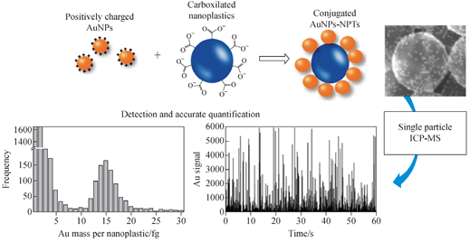 TED-GC-MS的原理是通过 TGA 等装置对微塑料聚合物进行提取分解后,将分解产物捕捉在固相萃取吸附器上,随后引入 GC-MS 对微塑料样品进行定性鉴定和 (半)定 量分析。与 Pyr-GC-MS 相比,TED-GC-MS可处理的样品量更大,达100 mg,使检测结果更具代表性;同时,鉴定结果不受加热引起的降解影响,基质干扰小,因此无需复杂的样品前处理,适用于环境样品的直接分析检测,且仪器维护成本低。实时直接分析(DART)是一种敞开式离子源,具有稳定、快速、实时、原位分析,以及高通量检测等优点,与质谱联用可以在无需样品前处理的情况下快速分析复杂样品,在环境样品分析检测中发挥了重要作用。实时直接分析质谱(DART-MS)与热脱附热裂解技术相结合,是一种快速鉴别微塑料种类并筛选添加剂的方法,其原理主要是微塑料上的聚合物添加剂在高温下热降解,生成的化合物在 DART正离子模式下离子化,再 进入高分辨质谱分析。Zhang等开发了一种潜在的高通量分析方法,利 用热分析结合 DART-Orbitrap MS表征工业、消费品和环境样品中的微塑料,建立了不同种类微塑料组成的指纹图谱,并对微塑料中的各种添加剂进行检测,实现了环境中微塑料的快速识别,并通过添加剂的种类和含量实现了对微塑料的溯源。该技术是微塑料种类鉴别和半定量分析的有效手段,具有较好的应用前景。单颗粒电感耦合等离子体质谱(sp-ICP-MS)是一种比较成熟的微纳米颗粒表征手段。稀释后的微纳米颗粒悬浊液进入ICP-MS 后,每个微纳米颗粒都会引起信号改变,计算产生的信号峰个数即可分析悬浊液中微纳米颗粒的数量, 信号强弱则与微纳米颗粒的质量大小相关。因此,sp-ICP-MS可用于纳米颗粒的元素组成、质量分 布、颗 粒 浓 度 等 检 测 分 析。Fernandez等基于碳监测的sp-ICP-MS用于微塑料的检测和尺寸表征,用1、2.5μm 聚苯乙烯微球模拟塑料垃圾中的微塑料,借助搭载四极杆的ICP-MS仪超快速监测瞬态信号,检测13C+ 信号强度,以表征单个微粒产生的信号峰值,检测结果示于图4,证明了该技术在提供质量浓度、颗粒数量浓度和微塑料尺寸分布信息方面的潜力。将该技术还可用于筛选个人护理产品和食品包装中释放的微塑料。sp-ICP-MS技术还可间接检测微塑料的颗粒浓度。如在聚苯乙烯纳米塑料上包裹带正电荷的金纳米颗粒(最低可检测尺寸为135nm),通过检测197Au可准确获得样品中纳米塑料的颗粒浓度,示于图5。未来,sp-ICP-MS将在暴露环境中微塑料的检测以及风险评估中发挥重要作用。