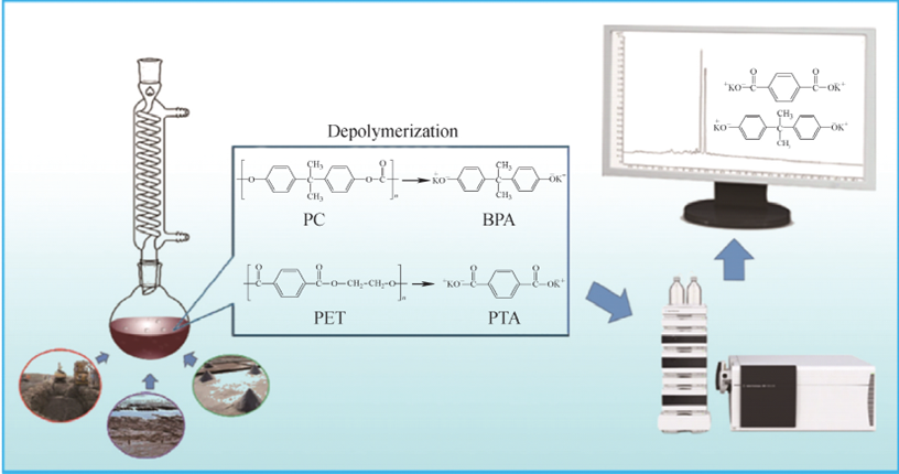 实验考察了激光能量、基质、分析物和离子化试剂等因素对测定结果的影响。在优化的条件下,采用 MALDI-TOF-MS 法对航空杯颗粒中的新鲜微塑料和从河流沉积物中提取的老化微塑料进行定性、定量分析。该技术不仅为微塑料表征提供了一种有效的分析方法, 也为将来使用 MALDI-TOF-MS成像技术进行微塑料的原位分布及在环境和生物样本间的相互转化等研究提供了思路。MALDI-TOF-MS不仅可通过具有指纹特征的质谱峰鉴定聚苯乙烯类的微/纳米塑料,还可通过特征峰进行定量分析。同时,MALDI-TOF-MS与热裂解技术相结合可以有效提高低质量区指纹峰的离子强度。如在380 ℃进行简单的加热预处理,可促进聚苯乙烯碎片化,显著增强低质量范围的指纹峰强度,使聚苯乙烯类微塑料的检测限可达25ng。该方法同样适用于检测聚对苯二甲酸乙二醇酯类微塑料。液相色谱-质谱(LC-MS)联用技术在微塑料的直接表征中应用较少,通常需要将微塑料进行解聚,生成特征小分子,再进行定量分析。利用碱辅助的热解聚使聚碳酸酯和聚对苯二甲酸乙二醇酯降解,再对降解产物 进行 LC- MS/MS检测,即可对样品中的聚碳酸酯和聚对苯二甲酸乙二醇酯进行定量分析。该方法已成功用于污泥、海 洋沉积物、室 内灰尘、贻贝和蛤蜊消化残留物、海 盐和岩盐样品中聚碳酸酯和聚对苯二甲酸乙二醇酯类微塑料的定量检测,示于图7。