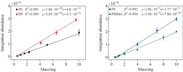 图3 便携式Pyr-GC-MS定量分析PE 和PP(a)、PS和PMMA(b)的标准曲线