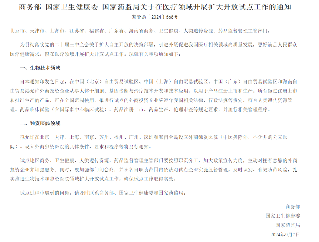 近日,北京经开区一企业就完成了营业执照变更,企业类型变更为港澳台投资,经营范围新增人体基因诊断与治疗技术开发等内容。该企业因此成为全国首家外商投资人体基因诊断与治疗技术企业,标志着医疗领域扩大开放试点政策率先在北京落地。 与此同时,北京经开区另一家主要从事基因甲基化研发的企业,也积极推进新政策应用,目前也已完成营业执照变更。 早在今年9月7日,商务部、国家卫健委、国家药监局发布了《关于在医疗领域开展扩大开放试点工作的通知》,明确了在中国(北京)自由贸易试验区、中国(上海)自由贸易试验区、中国(广东)自由贸易试验区和海南自由贸易港允许外商投资企业从事人体干细胞、基因诊断与治疗技术开发和技术应用,以用于产品注册上市和生产。 据悉,自政策发布以来,北京自贸试验区积极向企业宣贯,上门服务摸排诉求,半月累计触及目标企业就达数十家。由此看出,此次扩大开放试点,对相关外资企业来说,受欢迎程度,可见一斑。 此次扩大开放试点,体现了我国在医疗领域进一步开放的决心,强调了确保市场的公平竞争与可持续发展的重要性。但是否也意味着本土企业需要在政策支持下加强自身竞争力,以应对外资企业的竞争压力,还有待时间来说明。 但可以明确的是,监管部门需要加强对试点企业的监督管理,确保其在生产和经营过程中符合我国相关法律、行政法规等规定要求,并履行相关管理程序。 然而,在小编看来,更值得思考和注意的是——医疗领域扩大开放,是否会因为资本逐利,导至医疗费用上升,加剧看病难、看病贵的问题。再者,放宽投资限制,还有可能使优质医疗资源向高端市场集中,从而导至普通患者更难获得高质量的医疗服务。 而对于医疗行业而言,新政在吸引国际医疗机构和企业进入中国市场的同时,很有可能会对现有的国内医疗市场带来一定冲击。但反过来看,这或许也是一个很好的契机,国内医疗行业在这样的良性竞争下,将更加关注自身的经营理念、发展战略、技术更新等核心要素,通过良性竞争促进自身可持续发展。 总而言之,医疗领域的开放试点将是一个长期而复杂的过程,不仅需要政策的持续优化,更需要从业者、消费者和相关方的共同努力。期待在不久的将来,我们能够见证我国医疗服务整体水平和国际竞争力的提升;见证更多先进医疗技术和产品的涌现,为人民群众带来更加优质、高效的医疗健康服务。 |