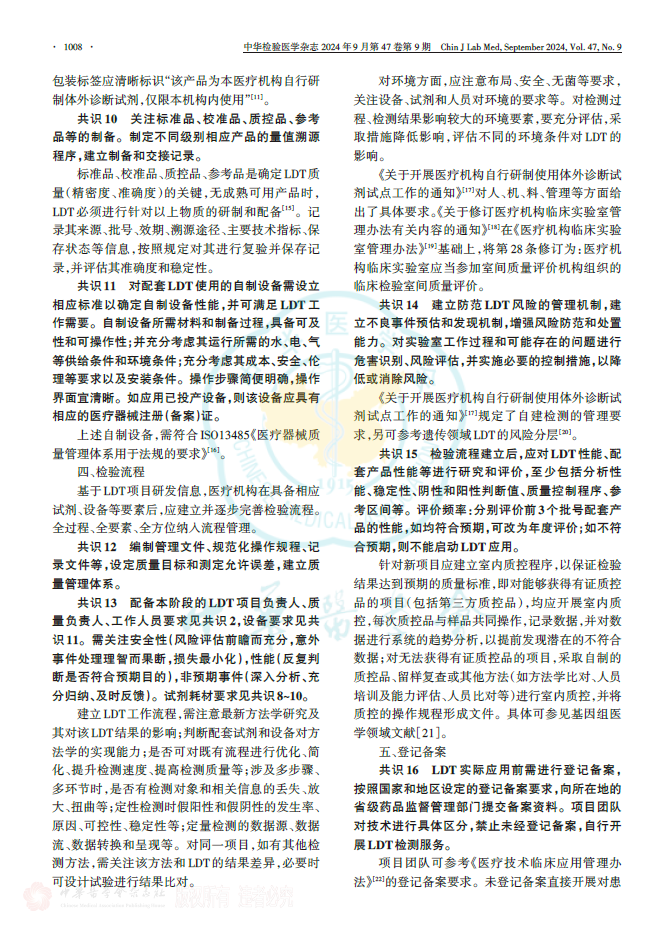 伴随临床医学和检验医学的不断演进,医疗机构对实验室自建检测方法(包括自制试剂等)的流程与管理规范化的需求极为迫切。该共识以自建检测的质量、风险、性能三大核心关键要素为基点,围绕术语阐释、研发与产品准备事宜、检验流程设计、登记备案要求、督查举措、检验前中后环节要点、转化应用以及推广等内容,给出了具有共识性的建议,期望能为医疗机构开展相应工作提供有益参考。 主要共识如下: 共识1: LDT的选择需以临床需求为导向,由检验科和临床科室讨论后共同提出。LDT项目应为国内尚无同品种产品上市或与现有产品相比,性能有重大改进或提升,其临床意义明确,且已有国内外相关临床诊疗指南、共识推荐或临床研究表明其具备临床应用条件。对长期运行不佳、未获得认可[国际标准化组织(International Organization for Standardization,ISO)15189认可是前提;参考美国病理学家协会(College of American Pathologists,CAP)认可标准]的实验室,不建议开展LDT工作。对可开展LDT工作的医疗机构,建议首批LDT项目数量不宜超过3项。 以下情况,可开展LDT:(1)某疾病的诊断、治疗和预后监测等缺乏性能更佳的实验室检查,国际或国内高质量文献显示某检查项目已成熟,但尚未获得国内医疗器械注册证。(2)基础研究显示某标志物的检测技术和临床意义趋于成熟,且具有临床需求,可进行本地化应用。建议先开展小范围临床应用研究,积累一定数据后,经科学性评审,再进行LDT。 共识2: LDT主管部门应根据研发项目技术要求等具体情况组建项目团队,任命项目负责人和质量负责人,确定研发团队成员。 共识3:医疗机构应组织专业评审委员(如科学性评审委员会、伦理评审委员会)对LDT的研究方案(必要性、科学性、安全性、可行性和伦理等)进行评审,以确定拟开展的LDT确实符合临床需求,并且为国内无同类产品上市的体外诊断方法。LDT项目团队应对以上要求形成可行性报告,评审通过后方可开始研发工作。科学性需突出方法学的同质性、结果的准确性和一致性、诊疗价值的不可替代性等,伦理需强调患者利益最大化。 共识4:制定研究开发程序,明确LDT开发计划,阶段划分,输入和/或输出要求,各阶段评审、确认要求,项目风险管理机制,责任归属以及项目实施预算。 共识5:应对LDT项目进行分析性能确认,以确保性能指标满足技术要求,并保留确认结果和相关文件、记录、报告等。临床应用前应完成临床性能的初步确认,并为临床应用后反馈优化作好准备。 共识6:LDT项目选择及流程建立后,需分别进行临床应用评审,以确认IDT对临床诊疗具有不可替代价值。LDT项目负责人应主动与临床医生进行2轮及以上定期沟通(如早期每月,后期每季度、每年)。无实际临床应用价值的检测项目,则不能启动LDT。 共识7:医疗机构可自行制备检验试剂或耗材,也可在研发定型后委托具有医疗器械生产许可证且生产范围包括第二类或第三类体外诊断试剂的企业完成制备。受委托企业获批的产品类目需与LDT一致。 共识8:应根据原材料对产品性能、安全等的影响程度,明确关键物质原料及其质量标准,并进行检验或验证,以确保满足试剂制备要求。 共识9:医疗机构应对试剂和耗材制备进行管理,自行制备时需负全责,委托制备时需按合同规定,确保产品质量合格;制备过程需有记录、可回溯;制备环节具备相应的质控参数,形成记录并随产品交接;制备的产品标识清晰、内容完整,并有必要的应用、安全等提示;制备后的交接过程有记录和反馈机制。委托制备时,应在合同中规定双方人员职责,并按不低于同类产品的质量要求明确规定质量标准。 共识10:关注标准品、校准品、质控品、参考品等的制备。制定不同级别相应产品的量值溯源程序,建立制备和交接记录。 共识11:对配套LDT使用的自制设备需设立相应标准以确定自制设备性能,并可满足LDT工作需要。自制设备所需材料和制备过程,具备可及性和可操作性;并充分考虑其运行所需的水、电、气等供给条件和环境条件;充分考虑其成本、安全、伦理等要求以及安装条件。操作步骤简便明确,操作界面宜清晰。如应用已投产设备,则该设备应具有相应的医疗器械注册(备案)证。 共识12:编制管理文件、规范化操作规程、记录文件等,设定质量目标和测定允许误差,建立质量管理体系。 共识13:配备本阶段的LDT项目负责人、质量负责人、工作人员要求见共识2,设备要求见共识11。需关注安全性(风险评估前瞻而充分,意外事件处理理智而果断,损失最小化),性能(反复判断是否符合预期目的),非预期事件(深入分析、充分归纳、及时反馈)。试剂耗材要求见共识8~10。 共识14:建立防范LDT风险的管理机制,建立不良事件预估和发现机制,增强风险防范和处置能力。对实验室工作过程和可能存在的问题进行危害识别、风险评估,并实施必要的控制措施,以降低或消除风险。 共识15:检验流程建立后,应对LDT性能、配套产品性能等进行研究和评价,至少包括分析性能、稳定性、阴性和阳性判断值、质量控制程序、参考区间等。评价频率:分别评价前3个批号配套产品的性能,如均符合预期,可改为年度评价;如不符合预期,则不能启动 LDT应用。 共识16:LDT实际应用前需进行登记备案按照国家和地区设定的登记备案要求,向所在地的省级药品监督管理部门提交备案资料。项目团队对技术进行具