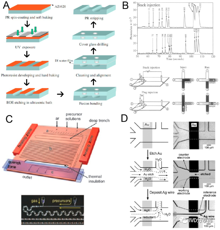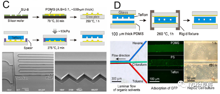 (C)高温转移模塑法热塑性塑料的微细加工;(D)完全使用聚四氟乙烯PFA制造的微流控芯片。
