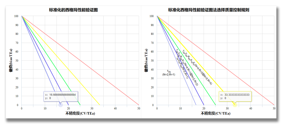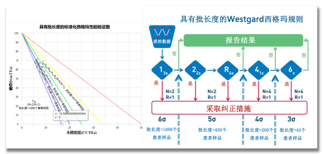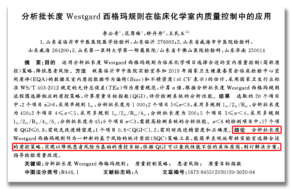 本实验室西格玛获取方式∑=(%TEa-%Bias)/%CV 4.具有批长度的Westgard西格玛质控规则规则介绍2018年美国临床化学年会(AACC)上,相关学者提出了分析批长度Westgard西格玛规则,是一种以不可接受结果最大预期数目为基础,将σ度量分析批长度列线图与Westgard西格玛规则流程图相结合而建立,规则中确定了标本分析批长度,降低了不可靠结果对患者造成伤害的风险,使实验室质控管理迈上了一个新台阶。 图 7 实验室分析使用具有批长度的标准化西格玛验证图及质量控制规则根据σ值和分析批长度Westgard西格玛规则选择相应的质控规则、质控品数目、质控次数及分析批长度。 分析批长度Westgard西格玛规则: (1)σ≥6时,采用单规则13s,运行中只检测2个水平的质控品(N=2),分析批长度为1000,每测定1000份标本就需要做1次质控。 (2)5≤σ<6采用多规则13s/22s/R4s ,运行中只检测2个水平的质控品(N=2),分析批长度为450,每测定450份标本就需要做1次质控。 (3)4≤σ<5,采用多规则13s/22s/R4s./41s,运行中检测2个水平的质控品2次(N=2x2),或者4个水平的质控品测1次(N=4),分析批长度为200,每测定200份标本就需要做2次质控。(4)3≤σ< 4,采用13s/22s/R4s./41s/6X,运行中检测2个水平的质控品3次(N=2x3),或者3个水平的质控品测2次(N=3x2),分析批长度为45,每测定45份标本就需要做3次质控。5.适用批长度的Westgard多规则质控的可行性查找资料,山东省临沂市中医院几位检验科老师,做了分析批长度Westgard西格玛规则在临床化学室内质量控制中的应用一文,经过分析得出结论,分析批长度Westgard西格玛规则作为一种新的基于风险的统计质控(SQC)策略工具,能简单直观地帮助实验室选择合适的质控策略,实现以降低患者风险为基础的质控目标;依据 QGI可以查找性能不佳的具体原因,制订解决方案,指导检验质量改进。