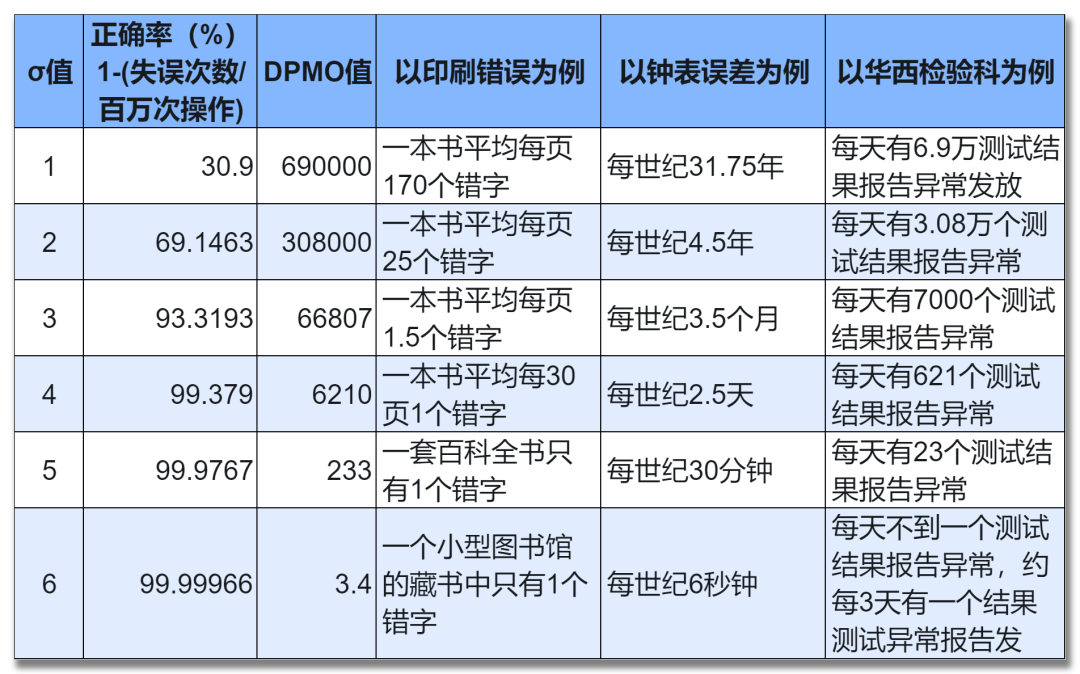 | 目前,大多数实验室主要采用Westgard多规则中的12s为警告,22s和13s为失控来控制检测系统的分析性能,各项目均使用统一的质控规则,存在较大的局限性。2014年,相关学者将经典的Westgard规则与6σ结合建立了Westgard西格玛规则,通过允许总误差(TEa)、检测系统的不精密度(CV)和偏倚(Bias),计算σ度量,为相关项目选择合适的质控规则,实现了质控的个性化设计! Westgard多规则质控与6σ管理结合的价值意义  图1 华西检验科数据参考官网估计数据(日均2w份标本,按每标本5个测试估计)DPMO于六西格玛的关系 DPMO(即:每百万次采样数的缺陷率)是指100万个机会里面,出现缺陷的机会是多少。这里有一个计算公式,即DPMO=(总的缺陷数/机会)x一百万分之一百万。如果DPMO是百万分之三点四,即达到99.99966%的合格率,那么这就叫六西格玛。(DPMO与西格玛的对应关系如上表所示) 使用6σ(Six Sigma)管理,一个小型不到百万字藏书读书馆中只有一个错别字,100年只差6秒钟,对于像华西检验科,每天不到一个测试结果异常,这些误差率在人们的生活中是可以接受的。但是假设飞机质量控制使用6个σ,那意味着每百万人飞上天空就有3.4个人死亡,那太可怕了,所以航空的质量控制需要更高,适用10个西格玛,意味着只有0.5个出错机会,即每百万人只有半个人意外的风险,合格率是99.99995%。从上面的案例可以看出六西格玛已经是一项以数据为基础,追求几乎完美的质量管理方法。其实大部分企业单位日常生产根本达不到六西格玛,大部分运行在3-4σ之间,象华西这样的超高标准实验室,使用的六西格玛规则并不适用于基础措施相对落后的乡镇医院检验室,目前根据国情并不能要求普遍使用六西格玛管理。第一次,1973年,Westgard多规则质控是建立在第一代Levey-Jennings质控规则之上,人们在使用过程中发现L·J质控图规则单一,不能满足日益需求的质量管理,随着社会生产发展需求,由J.Westgard于1973年在实验室质控方面采用以个人命名的Westgard第二代质控规则被大家广泛使用。 第二次,2004年,Westgard 多规则质控在使用过程中又遇到规则适用性问题,2004年J.Westgard先生再次提出西格玛管理规则形成现代化检验质量控制,它给通用电气带来的巨大变化吸引了华尔街的注意力,这使得六西格玛的理念和方法犹如旋风般迅速传遍全球。第三次,2018年,美国临床化学年会(AACC)上,相关学者又提出了分析批长度Westgard西格玛规则,它是一种新的基于患者风险的统计质控(SQC)策略工具,以不可接受结果最大预期数目为基础,将σ度量分析批长度列线图与Westgard西格玛规则流程图相结合而建立,规则中确定了标本分析批长度,降低了不可靠结果对患者造成伤害的风险,使实验室质控管理迈上了一个新台阶。
