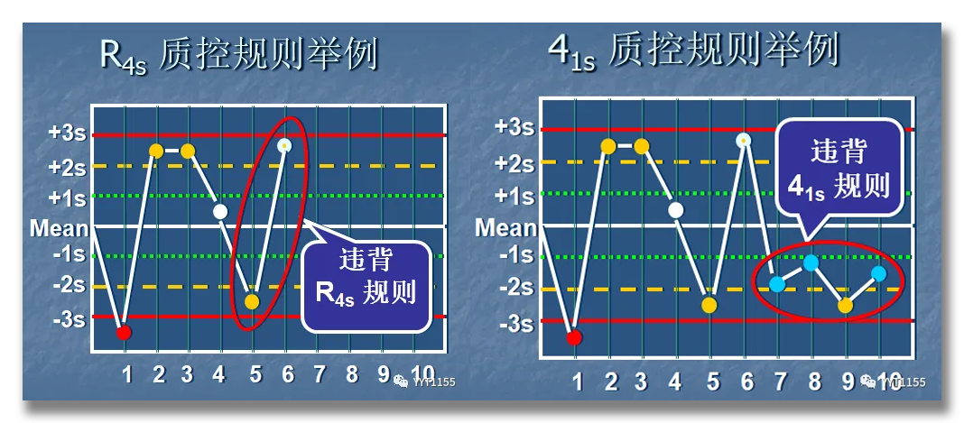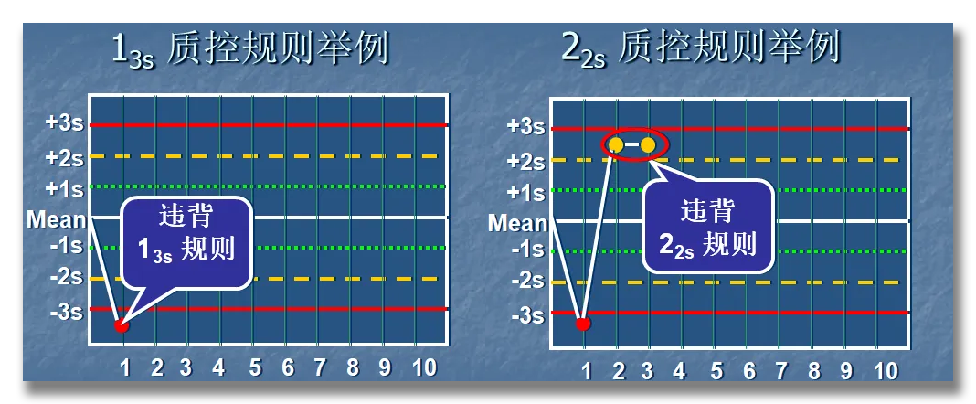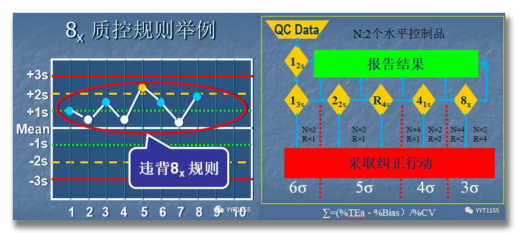 13s:单一水平的质控测量数据超出了平均值+3SD或者平均值-3SD的控制限范围为失控,有可能是随机误差,结果被拒绝,需要查找随机原因处理。22s:连续两个质控测量结果在同侧超过平均值+2SD或者平均值-2SD控制限,为系统性误差,结果失控,需要检查检测系统原因。R4s:两个质控水平的连续两次质控数据,或同批两个水平之间差异,一个超过了mean+2SD,一个超过了mean-2SD,为失控,判断为随机误差,应该注重分析随机原因。41s:四次连续的质控结果超过了同一侧的mean+1SD或者mean-1SD质控线,为失控。分析原因为系统误差,需要排除检测系统原因。8x:连续8个质控结果都落在均值的一侧,为失控,分析为系统误差,需要排除检测系统问题。还有其它质控规则如10x/12x等,因为换算问题,不常使用,这里不在赘述。最近笔者查询6x被加入到分析批长度的质控规则里。针对Westgard 多规则质控在使用过程中的规则适用性问题,每天需要做几个水平质控品?需要做几次?需要适用哪些质控规则?样本量少不支持多做怎么办?J.Westgard先生提出西格玛管理以解决,不同的是检验室质量管理水平差异很大,应该要计算自己科室的西格玛度量值,并不是直接选择6σ就OK,也不能盲目适用,这样不仅起不到质量控制作用,而且徒增工作量。 对于σ<3以下的科室,重点应该计算质量目标指数(QGI),评价检测系统的分析性能,提升科室整体质量管理。