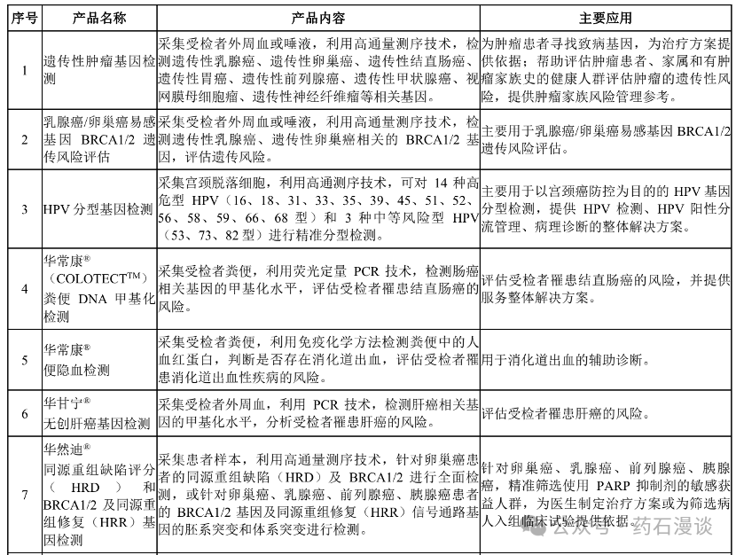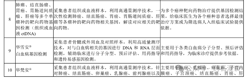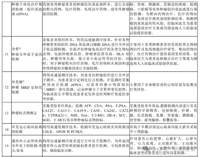 华大基因作为中国基因行业的奠基者,是全球屈指可数的科学技术服务提供商和精准医疗服务运营商。基因科技应用场景丰富,包括基因检测、基因诊断、基因治疗、基因合成等领域。目前应用市场集中在基因检测,核 心技术不仅包括测序(Sanger 测序、NGS 测序及单分子测序等),还包括 PCR、基因芯片、核酸质谱、光学图谱等技术, 在我国市场中用于进行基因检测的技术主要分为 PCR 技术、基因测序技术、FISH 技术和基因芯片技术四种。为各级医疗机构提供基于高通量测序、 PCR、酶联免疫、化学发光等技术平台的检测试剂,为国内外药厂提供高通量测序检测服务,参与临床前研究和临床试验 研究。主要服务包括:遗传性肿瘤基因检测、HPV 分型基因检测、DNA 甲基化检测、肿瘤标志物测定、肿瘤个体化诊疗 用药指导基因检测和肿瘤微小残留病灶(MRD)定制化检测等。通过其年报披露的肿瘤检测产品信息如下: