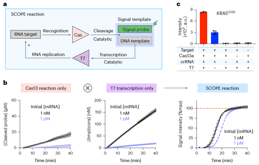 今天我们了解一个检测灵敏度低的mRNA检测技术SCOPE,该技术同时采用基于Cas13a旁切信号放大和T7转录的2种信号放大方法的联合策略,显著提高了检测灵敏度。 SCOPE技术的具体原理如图1所示,首先就是先利用集合靶标RNA序列后的Cas13a的旁切活性来释放和放大荧光信号,其次就是旁切后的T7转录活性被释放从而转录产生更多的靶标RNA片段,从而开始进一步放大信号,实现荧光信号强度的二次放大,而且整个过程也只需要不到1个小时,真的是又快又准。 图1引自[1] 和之前仅仅基于Cas13a的旁切活性放大信号的单一方式相比,SCOPE技术的旁切加转录来二次放大荧光信号的检测灵敏度更高,信号强度也更大(图2)。 图2引自[1] SCOPE的二级信号放大策略非常优秀,另外采用High FIdelity的Cas13a突变体也可以帮助有效的实现点突变级别的RNA检测,帮助降低假阳性,是一种非常好的RNA检测技术。 参考文献: 1. Song, J., Cho, M.H., Cho, H., Song, Y., Lee, S.W., Nam, H.C., Yoon, T.H., Shin, J.C., Hong, J.S., Kim, Y. and Ekanayake, E., 2024. Amplifying mutational profiling of extracellular vesicle mRNA with SCOPE. Nature Biotechnology, pp.1-11. |