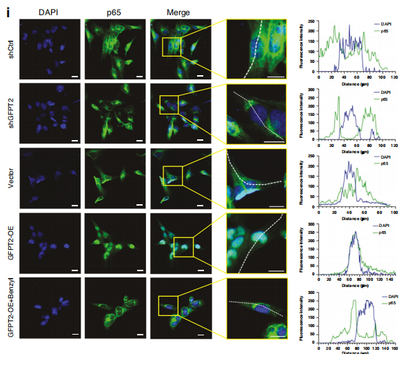 作者验证了GFPT2基因敲低显著降低了p65 O-糖基化水平,这可归因于GFPT2是HBP通路的限速酶,GFPT2的敲低导至了UDP-GlcNAc的减少。质谱分析显示,GFPT2过表达导至p65丝氨酸75的O-GlcNAcylation,这是一个已知的与p65核易位密切相关的磷酸化位点。过表达GFPT2可以增加p65的核易位水平,Benzyl-α-GlcNAc的加入逆转了这一现象,表明GFPT2通过O-糖基化调节p65核易位(图i)。