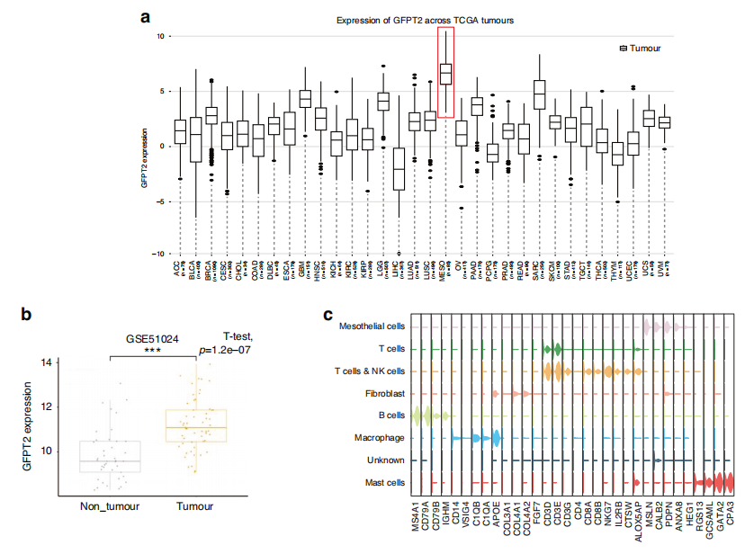 癌细胞通常在氨基已糖生物合成途径(HBP)中表现出更高的活性,其中谷氨酰胺-果糖-6-磷酸转氨酶2(GFPT2)是限速酶,可将谷氨酰胺转化为果糖-6-磷酸。这种酶对葡萄糖的合成至关重要,并与癌症的代谢景观的改变有关。对来自癌症基因组图谱(TCGA)数据库的32种不同类型癌症中GFPT2 mRNA的表达进行无偏分析后,发现与其他癌症相比,MESO中GFPT2的表达更为明显(图a)。GSE51024 的基因表达谱数据中,MESO中GFPT2水平显著增加(图b)。与正常间皮细胞相比,肿瘤细胞中GFPT2阳性细胞的比例显著升高,表达水平显著升高。