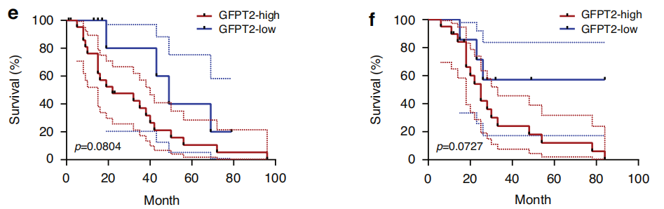 在胸膜和腹膜间皮瘤标本中,GFPT2高表达和低表达队列之间的生存结果没有统计学上的显著差异(图e,f),但显示了一种趋势,表明GFPT2高表达水平的患者预后可能较差。缺乏显著性可能源于样本量的限制。