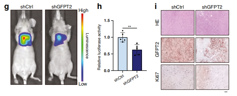 在体外,抑制GFPT2抑制了增殖潜能,而过表达则增强了增殖潜能。伤口愈合实验以及Transwell实验结果表明,敲除GFPT2抑制了MESO细胞的迁移和侵袭,而过表达GFPT2则促进了MESO细胞的迁移和侵袭(图k,m)。同样,体内动物模型的结果与体外结果一致,GFPT2基因敲低后肿瘤的生长速率显著降低,显著延长了原位肿瘤模型中小鼠的存活时间(图h)