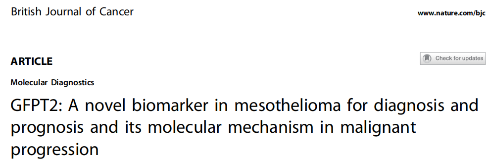 近日,杂志British Journal of Cancer上发表了一篇题为“GFPT2: A novel biomarker in mesothelioma for diagnosis and prognosis and its molecular mechanism in malignant progression”的文章,本研究(1)研究了谷氨酰胺-果糖-6-磷酸转氨酶2(GFPT2)作为MESO诊断和预后生物标志物,(2)验证GFPT2在MESO的恶性进展的作用,和(3)阐述GFPT2调节p65 O-GlcNAcylation和激活NF-κB信号通路的分子机制。