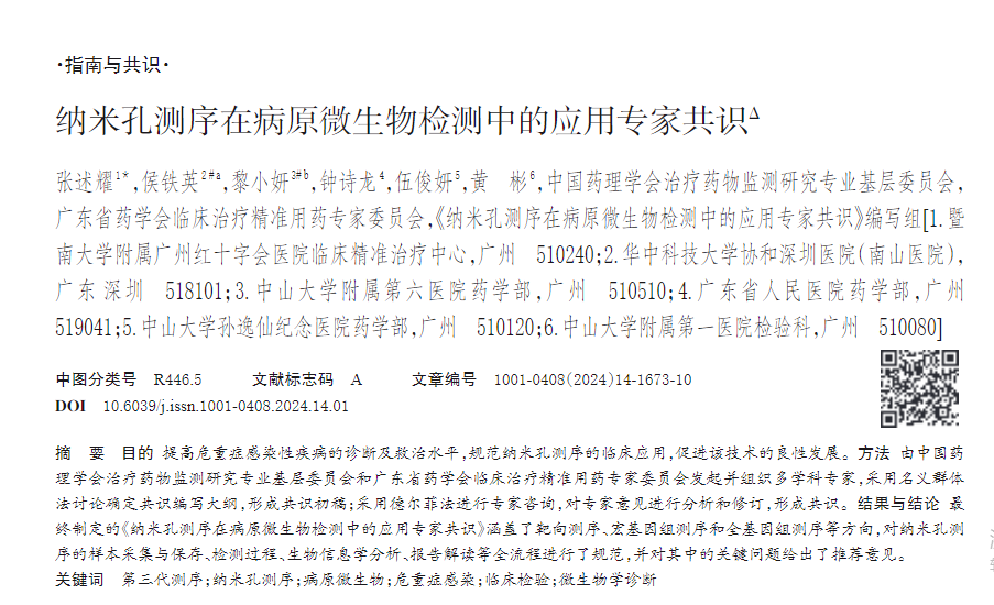 感染性疾病是由病原微生物引起的疾病的统称,目前仍然是全球公共卫生的重大威胁。实现病原微生物的快速精准检测对于感染性疾病的诊治具有非常重要的临床价值。近年来纳米孔测序已经在病原微生物检测、感染性疾病甚至重大公共卫生问题流行期间的诊断与防治等领域发挥了重要作用,也有多项基于纳米孔测序病原微生物检测的多中心研究开展,由此可见,临床急需适用于纳米孔测序的技术规范。为此,中国药理学会治疗药物监测研究专业基层委员会和广东省药学会临床治疗精准用药专家委员会联合发起制订了《纳米孔测序在病原微生物检测中的应用专家共识》。于2024年7月在《中国药房》(IF: 2.88)发表。