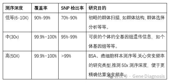 评估测序数据的标准 通常可以用三种方式来表示:以测序数据量的Gb数、以测序产出的reads数、以测序深度的倍数(X): 1. 以测序数据量表示:测序数据量指的是整个测序实验中生成的总碱基对(bp, base pairs)数量。通常用 Gb(gigabases,10^9碱基对) 或 Mb(megabases,10^6碱基对) 作为单位。测序深度与Gb数的换算通常取决于测序平台的产量以及基因组的大小。例如,如果一个人的基因组大小为3Gb,而测序深度为30x,则总共需要测序90Gb的数据量。 2. 以reads数表示:reads是测序仪器输出的每个碱基的序列数据。测序深度与reads数的换算取决于基因组的大小以及测序平台的reads长度。通常,reads数可以通过Gb数除以每个reads的大小来计算得到。 3. 以测序深度的倍数(X)表示:测序深度(Sequencing Depth)是指测序得到的碱基总量(bp)与目标基因组大小的比值,即测序深度=数据量大小 / 目标基因组大小。或者理解为目标基因组区间内中每个碱基被测序到的平均次数,如测序数据量为1G,测序的基因组大小为1M,那么测序深度为1G/1M=1000×,表示平均每个碱基被测了1000次。 这三个参数相互计算公式为: 测序数据量(bp)=目标区域大小(bp)×测序深度(x) 测序数据量(bp)=reads长度 X reads个数 (reads长度很容易得知,reads个数等于测序所得到的fastq文件的总reads数,计算时候需要注意单端与双端测序) 正常来说,测序读长是由测序仪器与试剂盒决定,而我们能够设定的参数主要就是reads,测序深度和数据。 测序深度是根据所需样本类型与实验目的来决定,测序深度越高,所得到的数据量也就越大,如对一个3Gb的基因组测序,30X深度需要90Gb数据,而100X深度需要300Gb。测序深度不足,会导至结果的不稳定,如基因组覆盖不全或者错过低频的突变信息,如下图: 但是过多的测序深度,或导至分析难度与成本的提高,而且超过一定的深度,即使数据量再增加,分析结果的提升也有限。所以对于常见的测序类型,都会有一个推荐的范围,根据测序深度,推算出所需要的数据量或者reads数目进行测序。 不同类型实验的推荐深度与数据量(二代测序)