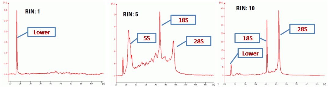 凝胶电泳法是一种不敏感的检测样品完整性的方法,需要大量的样品,不适合少量样本的评价。另外,这种方法依赖于人工对凝胶图像的解读,因此较为主观,难以进行实验室之间的比较,并且得到的数据难以进行数字化处理。 毛细管凝胶电泳法 利用微流体芯片技术,对核酸样品进行高分辨率电泳分析。Bioanalyzer能精确地测定样品的RNA完整性(RIN值)或DNA片段大小和浓度,特别适合高通量检测。依据RIN值可对RNA的完整性进行评分,RIN值越高,代表RNA的完整性越好。 如Agilent旗下的bioanalyzer仪器,使用RNA Integrity Number (RIN) 对RNA完整性进行评估,直观地判断出RNA样本的降解程度。 RIN值范围为1~10,不同数值代表着样品RNA的不同降解程度,通常,RIN值越高,表明RNA质量越好,则二代测序的数据质量也越高; RIN值>7,:高质量RNA; RIN值6-7:部分RNA降解,勉强可用; RIN值<6:质量较差RNA。 |