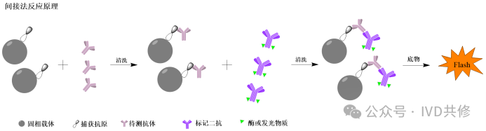 双抗体夹心法:样本中的待测抗原与固相载体上的捕获抗体反应形成”固相载体-捕获抗体-待测抗原“复合物,清洗后,再加入标记抗体,形成”固相载体-捕获抗体-待测抗原-标记抗体“双抗体夹心复合物,检测信号与样本中待测抗原的量成正相关。反应原理如下图:双抗原夹心法:样本中的待测抗体与固相载体上的捕获抗原反应形成”固相载体-捕获抗原-待测抗体“复合物,清洗后,再加入标记抗原,形成”固相载体-捕获抗原-待测抗体-标记抗原“双抗原夹心复合物,检测信号与样本中待测抗体的量成正相关。反应原理如下图:由于夹心法需要对抗体或抗原进行标记,抗体用酶或者发光物质标记后一般情况下不会影响稳定性,但是抗原用酶或发光物质标记后容易导至构象变化导至稳定性下降,因此夹心法也有变体模式,主要体现在标记端,反应原理如下:双抗体夹心法:需要待测抗原的抗原决定簇数量≥2个,抗原决定簇一般由四到八个氨基酸残基组成,一个氨基酸的平均分子量为110Da,因此待测抗原的最小分子量为880Da,但是实际情况下由于空间位阻原因,因此待测抗原的分子量要远远大于880Da。笔者目前遇到的最小待测抗原约为2kd(个人观点,仅供参考)。双抗原夹心法:由于待测抗体为同型二价抗体,因此捕获抗原和标记抗原需要含有共同的抗原决定簇。如果在原料搭配时,发现没有信号,有一种可能性就是捕获抗原和标记抗原缺乏共同的抗原决定簇(个人观点,仅供参考)。优点:(1)两种抗体均为特异性结合,灵敏度高;(2)由于使用了两种不同的抗体,夹心法可以降低非特异性结合,特异性好;(3)夹心法信号值和浓度值的比例关系很好,因此曲线宽、线性好;(4)同时反应原理简单,易于操作。缺点:(1)易受RF、异嗜性抗体、人抗动物抗体等干扰物质的影响,需要加入阻断剂或者对原料进行改造,成本高。(2)使用夹心法检测抗体时,检测的是样本中的总抗体,无法对抗体的种类进行区分(该点有时也是优点)。(3)抗原进行标记时容易改变构象,引起沉淀或者稳定性下降。总之,夹心法是一种高灵敏度和高特异性的免疫检测方法,适用于多种生物样本的分析。然而,其成功与否依赖于抗体的质量和选择,且在某些情况下可能受到样本中其他成分的干扰。因此,在实际应用中,需要综合考虑其优缺点,选择合适的检测方法。 间接法检测IgG:样本中的待测抗体与固相载体上的捕获抗原反应形成”固相载体-捕获抗原-待测抗体“复合物,清洗后,再加入标记二抗,形成”固相载体-捕获抗原-待测抗体-标记二抗“复合物,检测信号与样本中待测抗体的量成正相关。反应原理如下图:间接法:需要区分抗体的类别,特别是检测样本中的IgG型抗体时,一般首选间接法(标记二抗选择抗人IgG抗体);有时也使用间接法检测IgM型抗体(标记二抗选择抗人IgM抗体)。使用间接法检测IgG型抗体时,需要考虑IgM型抗体的干扰,因此需要筛选对IgM型抗体交叉反应小的二抗(抗人IgG抗体)。使用间接法检测IgM型抗体时,需要考虑在体系中增加去除IgG型抗体的措施(比如添加IgG去除试剂等)。PS:二抗通常是指用于识别和结合一抗(Primary Antibody)的抗体。优点:(1)灵敏度高,通过二抗与一抗的结合,可以实现信号的放大,提高检测的灵敏度。(2)灵活度高,二抗作为标记物可以多个项目共用,且成本较低。(3)间接法的基本原理相对简单,通常只需使用一个抗原和一个通用二抗。这种简化的体系使得实验设计和操作更为直观,降低了实验的复杂性。缺点:(1)一般特异性较差,主要是由于固相载体如果吸附了抗体,则必然会导至假阳性,因此使用间接法时,需要重点优化固相。(2)可能的交叉反应,如果二抗不够特异,可能会导至交叉反应,从而影响结果的准确性。总之,间接法是一种灵活且有效的免疫检测方法,广泛应用于临床和研究领域。尽管存在一些缺点,但通过适当的实验设计和优化,间接法仍然是许多免疫检测中的首选方法。免疫测定原理-捕获法捕获法检测IgM抗体:样本中的待测抗体与固相载体上的捕获二抗(抗人IgM,抗μ链)反应形成”固相载体-捕获二抗-待测抗体“复合物,清洗后,再加入标记抗原,形成”固相载体-捕获二抗-待测抗体-标记抗原“复合物,检测信号与样本中待测抗体的量成正相关。反应原理如下图:捕获法:主要用于IgM型抗体或者IgA型抗体的检测(为了避免样本中IgG型抗体的干扰)。IgM型抗体主要在感染的早期产生,因此适用于传染性疾病(病毒性感染)的早期诊断。优点:(1)特异性好,检测IgM型抗体时一般需要稀释,可以降低干扰物质的浓度。(2)灵敏度高,捕获法能够检测到低浓度的IgM抗体,主要是由于IgM的效价高,只要捕获到一分子的IgM就结合多个抗原产生信号(理论上IgM型抗体为10价)。(3)捕获法的基本原理相对简单,固相载体可以共用,可以降低实验的复杂性,并且成本较低。缺点:(1)需要对抗原进行标记,需要摸索最优条件以降低标记对抗原的影响。(2)需要稀释,导至检测时间较长。(3)容易受IgG抗体的影响。(4)捕获法的测量范围较窄,且稀释不呈线性。总之,捕获法检测IgM抗体具有高特异性和灵敏度,适合早期感染的诊断,但也面临需要对抗原进行标记、检测时间长和信号干扰等挑战。在实际应用中,需要综合考虑这些优缺点,以选择合适的检测方法。