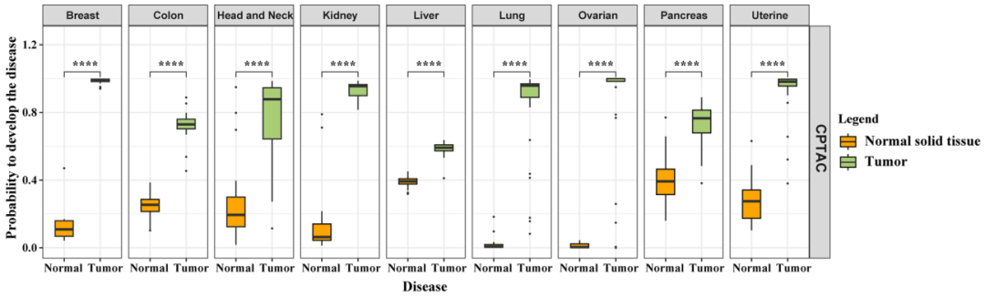 作者分析了来自乳腺癌、结肠癌、头颈癌、肾癌、肝癌、肺癌、卵巢癌、胰腺癌和子宫癌及其相应对照组织的局部蛋白质组学数据。结果发现在所有癌症中,只需一种蛋白质足以区分肿瘤组织和正常组织,中位AUC为1.00(0.91-1.00)。此外,使用多达15种蛋白质时,平均AUC为1.00(0.97-1.00)(如下图)。