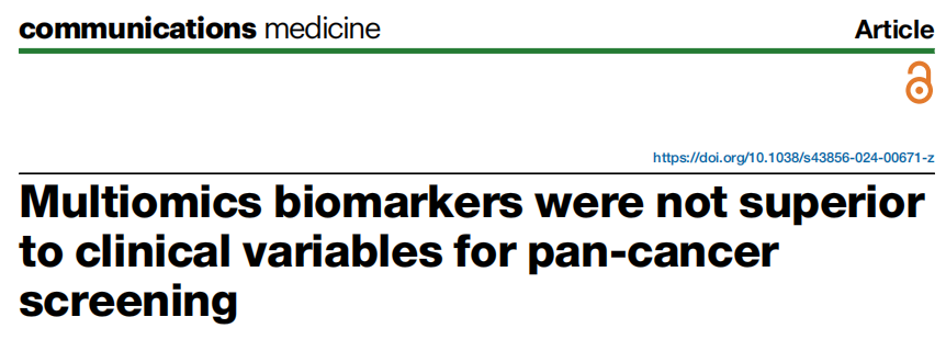 近日,杂志Communications medicine上发表了一篇题为“Multiomics biomarkers were not superior to clinical variables for pan-cancer screening”的文章。作者利用来自英国生物银行50万参与者的多组学数据,测试基于多组学数据的外周血生物标志物是否可以改善癌症筛查。结果表明,蛋白质组学、代谢组学或基因组生物标志物未显示出优于泛癌症筛查的临床变量,但对于一些高度血管化器官的癌症如肾脏和甲状腺,观察到有希望的结果,AUC大于0.8,可能在临床上有用。