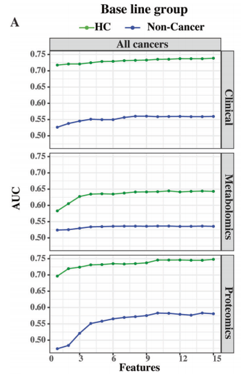 使用机器学习分析来自多组学和临床数据的潜在生物标志物的表现。结果发现癌症患者与健康对照的比较在蛋白质组学、临床变量和基因组学方面产生了相似的AUC (分别为0.75、0.74和0.72)。相比之下,代谢组学最高的AUC仅为0.64。纳入更多特征,AUC仅有略微改善(下图A)。当将癌症患者与非癌症患者进行比较时,基因组学、临床变量和代谢组学的AUC均下降(分别为0.74至0.56、0.72至0.51和0.64至0.54)。