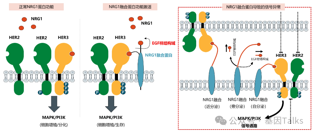 NRG1是一种配体,包含HER3/HER4激活所必须的EGF样结构域。NRG1基因融合可产生独特的“融合蛋白”,但只要融合蛋白的NRG1部分保留其活性成分(胞外EGF样结构域),融合蛋白就会过度表达并在不应该激活的时候激活HER3(无激酶域),HER3又可与HER2(有激酶域)结合形成异二聚体,进而激活下游信号通路(MAPK和PI3K),导至细胞增殖或分化,并最终导至癌症的发生。