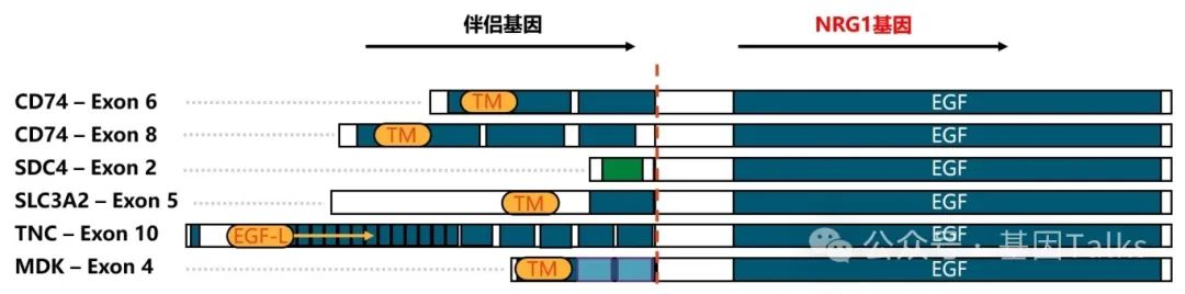 NRG1基因融合有多种不同的融合伴侣或组合,有的是跨膜蛋白(如CD74、SDC4等),有的是非跨膜蛋白(如RBPMS等)。其中,非小细胞肺癌中主要融合伴侣基因是CD74SLC3A2SDC4胰腺导管腺癌中主要融合伴侣基因是ATP1B1